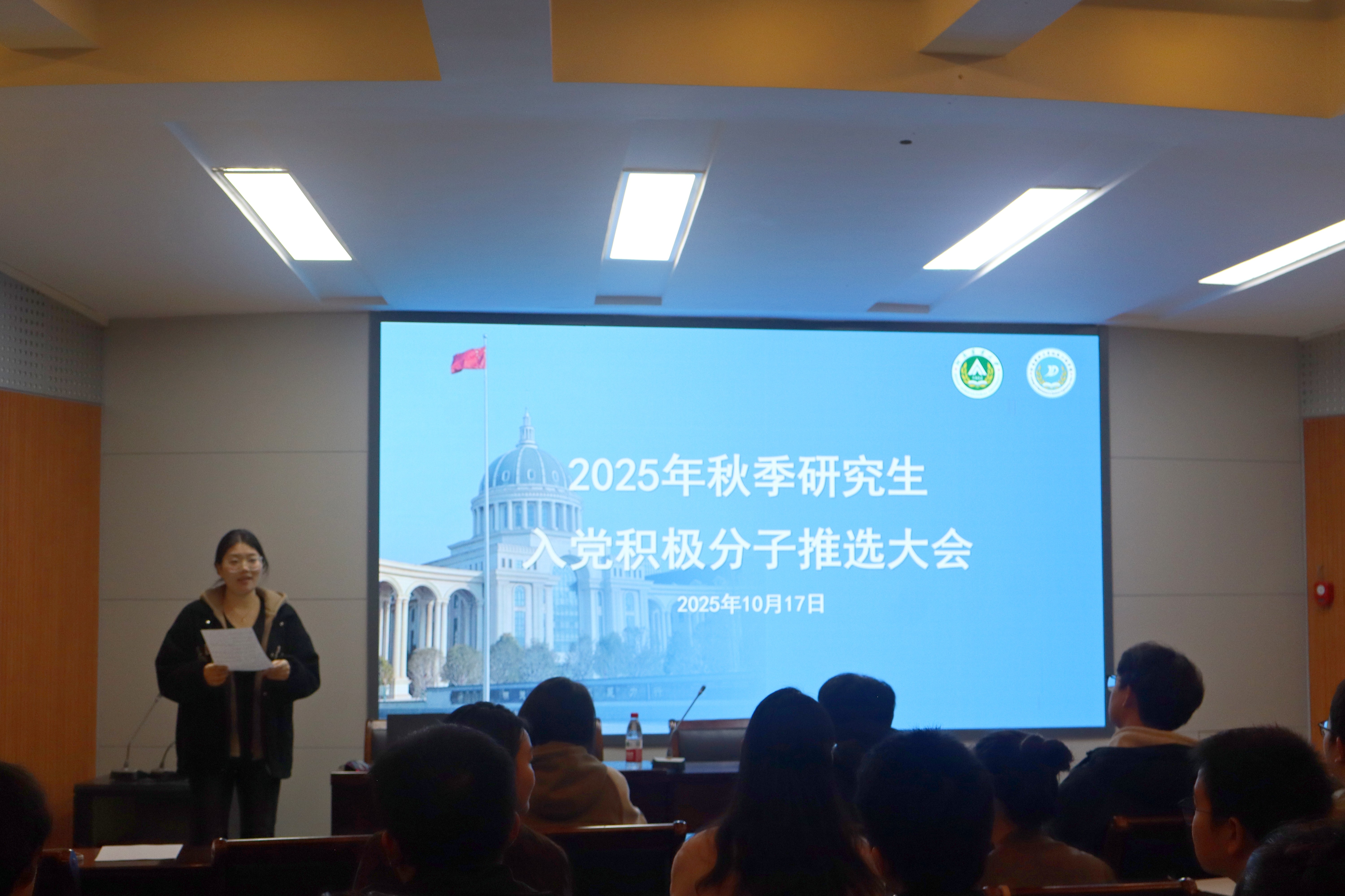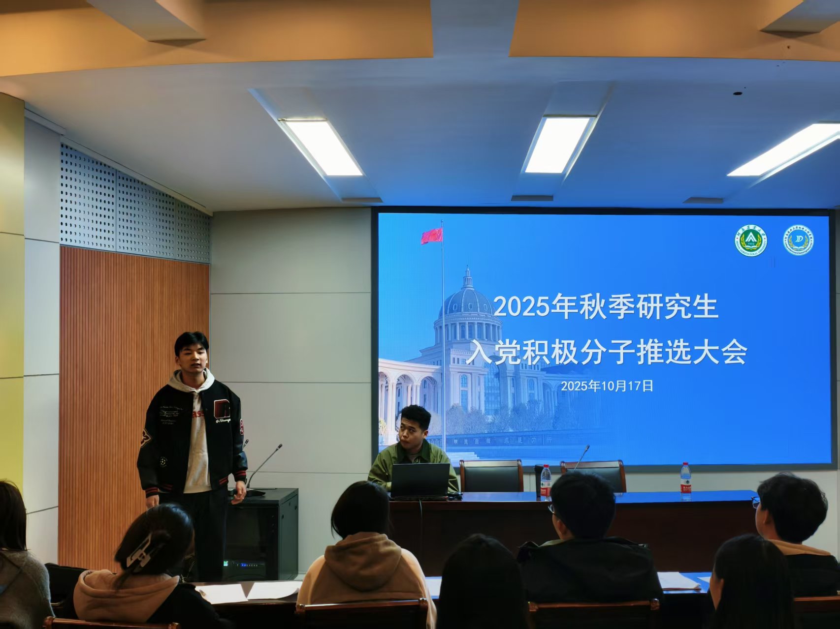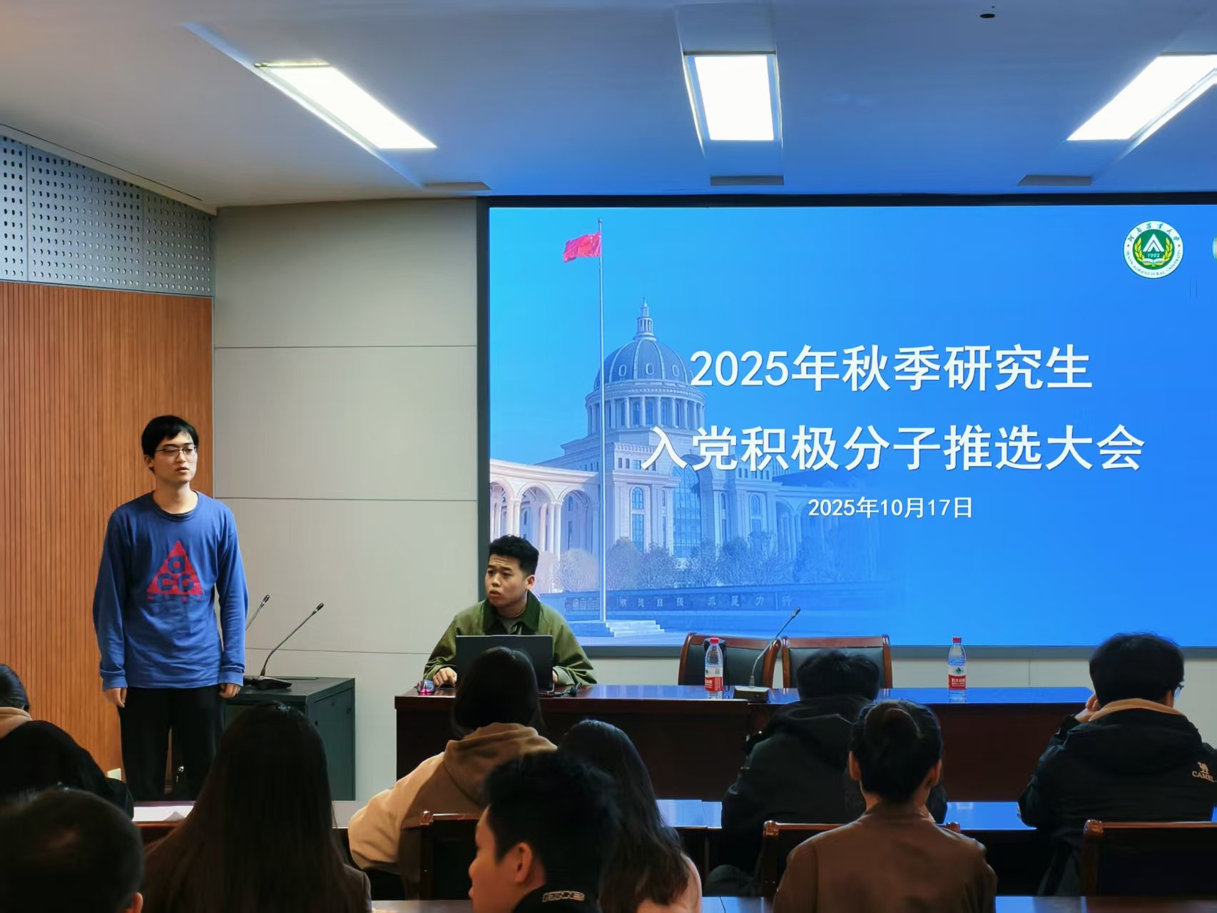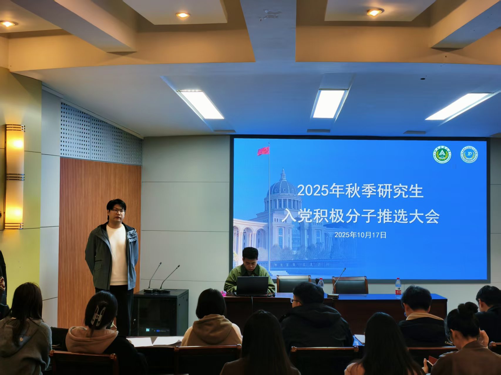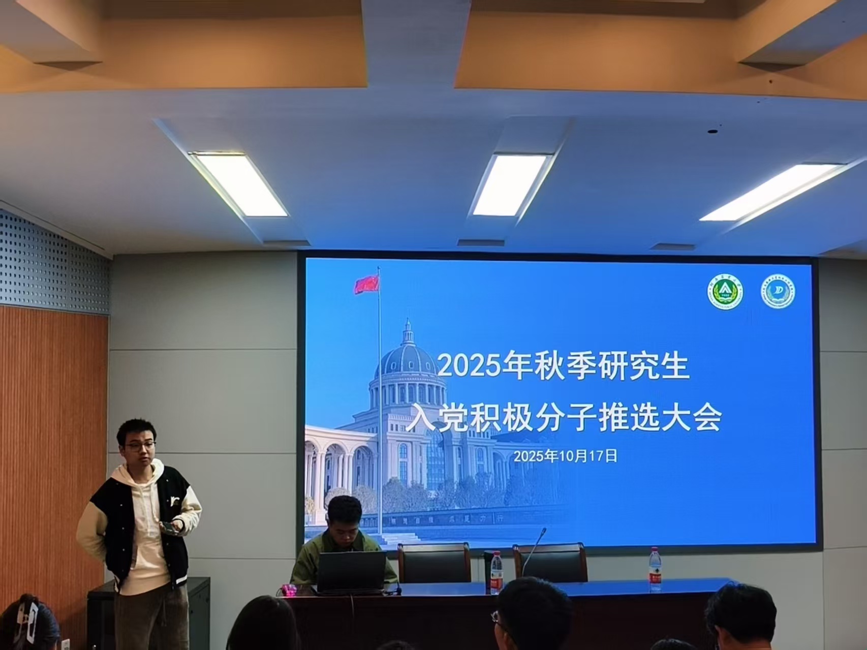 研究生2025级研究生流动团员团支部在文化路校区100人报告厅召开2025年秋季学期入党积极分子推优大会。会议由研究生第一党支部书记樊淘宁同志主持,研究生辅导员李锦、研究生各党支部支委和全体25级研究生参加会议。