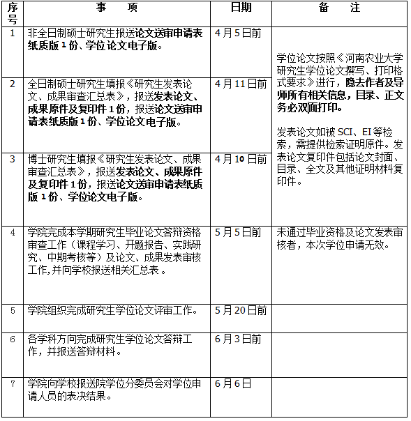 4、学院将严格按照《河南农业大学研究生手册》相关文件要求,坚持标准,认真组织,统筹安排。各学科方向须按时上报有关材料,确保学院本学期研究生论文答辩与学位申请工作平稳有序地进行。