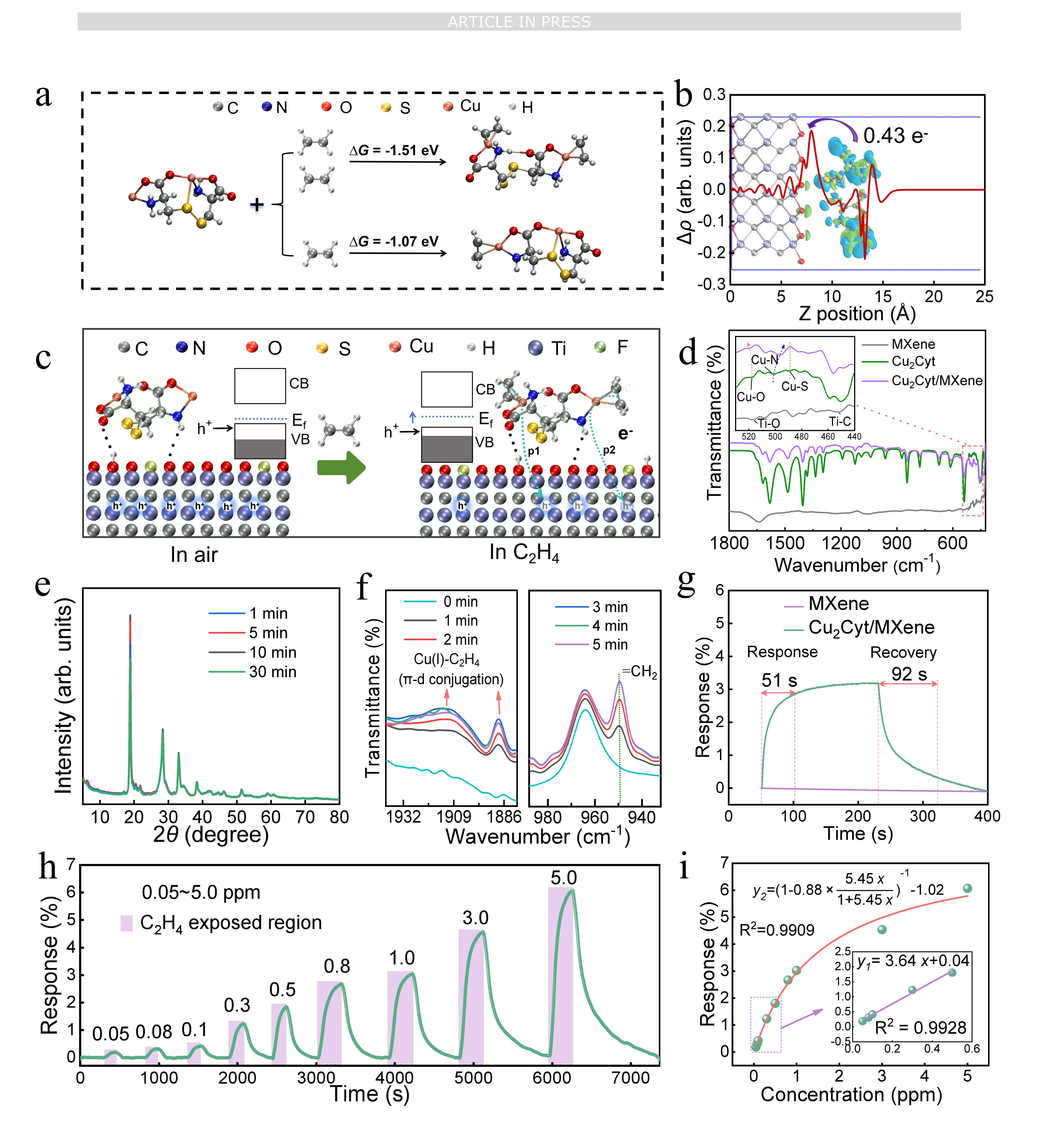 为实现高效的信号转导,将Cu₂Cyt与2D半导体材料MXene进行复合,构建了异质结传感结构。通过多尺度表征手段与理论计算,系统阐释了其中的级联电子转移传感机制:当乙烯分子被Cu+活性位点特异性捕获后,电子首先从乙烯分子传递至Cu2Cyt,随后进一步转移至p型半导体MXene基底。这一过程会降低MXene中的空穴载流子浓度,从而引起电极电阻发生规律性变化,最终实现对乙烯气体浓度的精准监测。