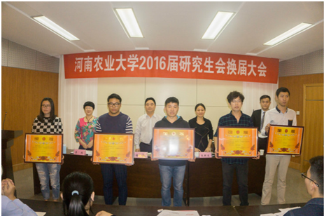 2015届研究生会荣获“河南农业大学优秀研究生分会”称号,汤亚东同学荣获“河南农业大学优秀研究生会干部”称号。校党委副书记、工会主席褚金海,校团委副书记王照兰,校研究生党委工作部部长李为出席此次会议,并为获奖单位和获奖研究生代表颁发了奖状及证书。