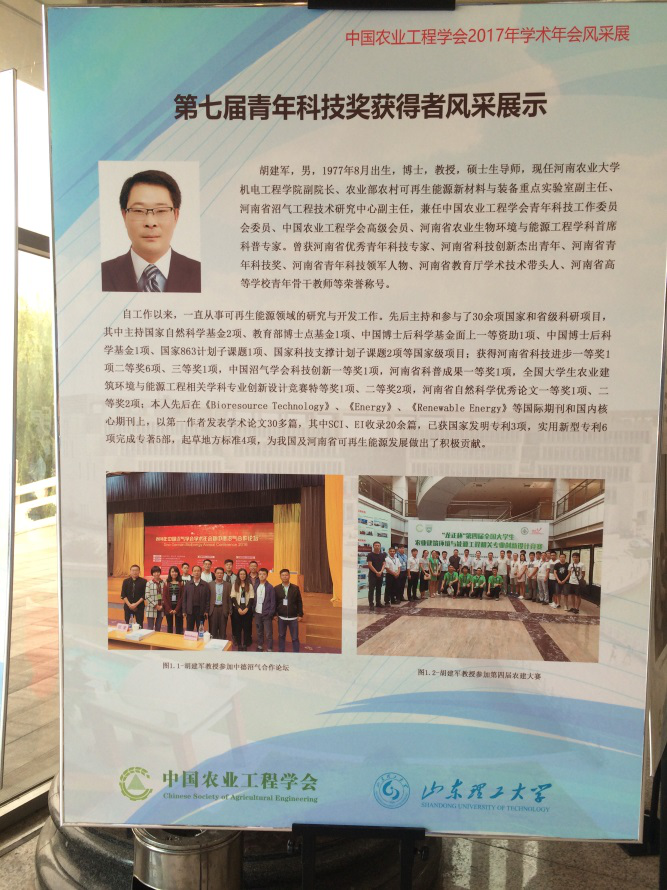 副校长张全国、学院党委书记李世欣、院长徐广印、副院长胡建军以及学院部分师生共计50余人参加了此次会议。胡建军教授获得中国农业工程学会第七届青年科技奖。博士研究生李亚猛、朱晨辉、杨立权,硕士研究生刘会亮、李冲分别作了分会场报告,其中李亚猛和朱晨辉获得“中国农业工程学会2017年学术年会青年学生优秀论文奖”。