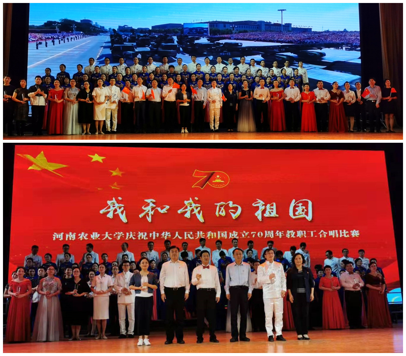 9月29日晚,学校大礼堂内华灯璀璨、歌舞欢腾。为热烈庆祝中华人民共和国成立70周年,由校工会举办的“我和我的祖国”教职工合唱比赛在这里隆重上演。校党委书记魏蒙关,校党委副书记、工会主席李成吾,副校长尹新明与两千余名师生共同参加了教职工合唱比赛。学院领导班子高度重视,院分工会精心组织排练,教职工用心合唱《东方之珠》,唱出了大家对祖国的美好祝愿,荣获合唱比赛一等奖。