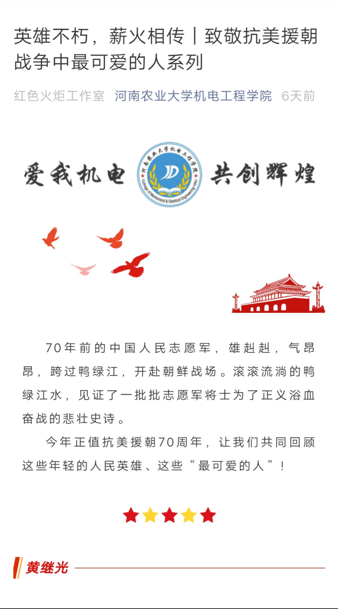 官方微信公众号开设“英雄不朽,薪火相传”专栏,推送“抗美援朝战争中最可爱的人”系列文章五期,通过讲述黄继光、杨根思、邱少云、杨连第等多名抗美援朝战争中人民英雄的感人事迹,在全院范围内营造致敬英雄,争做时代新人的浓厚氛围。11月3日-5日,在工程楼前广场,通过英雄事迹宣传展板、优秀红色征文作品展示、红歌歌唱、故事诵读、留言板留言等多种形式,展示英雄们的个人事迹、生平发展及为捍卫祖国和平所作出的牺牲与贡献,更加唤起了广大师生对那段浴血奋战抗争史的追忆,对牺牲烈士的缅怀与致敬。红色征文作品及留言板中一字一句,抒写着同学们对先辈英雄的追念,对革命精神的传承。本次活动形式多样,内容丰富,进一步增强了全院师生的爱国信仰与使命担当。
