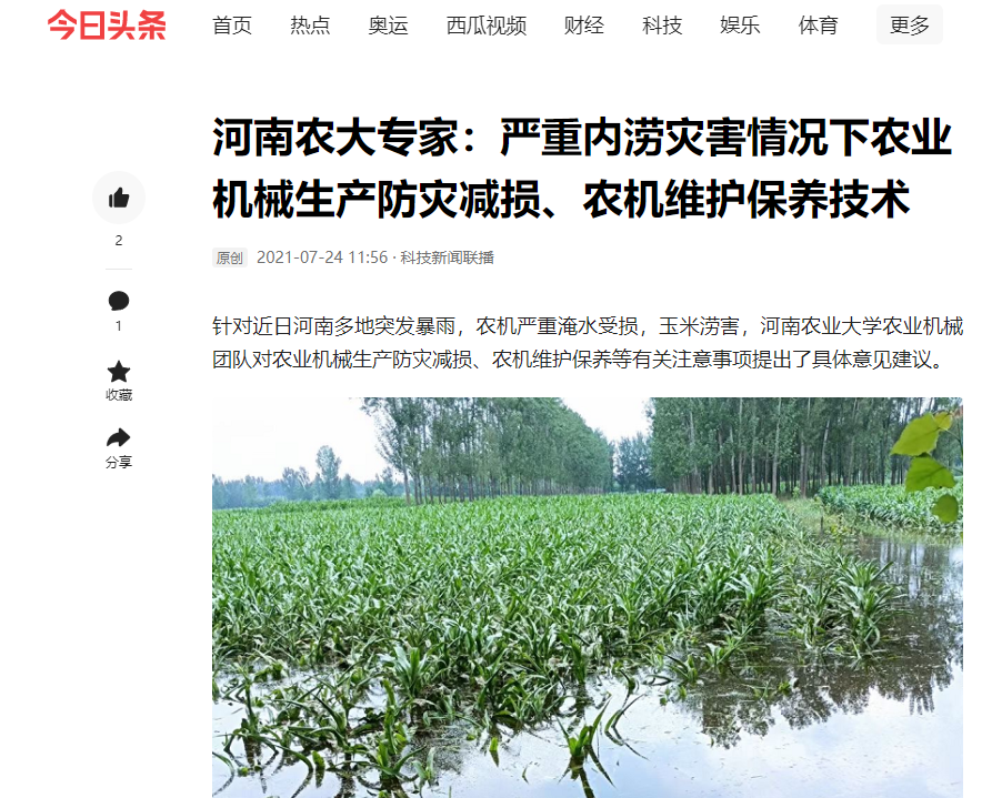 线上服务方面,农机系组织撰写的“严重内涝灾害情况下农业机械生产防灾减损、农机维护保养技术”在“今日头条、人民号”网站转载,指导各地抗灾救灾。