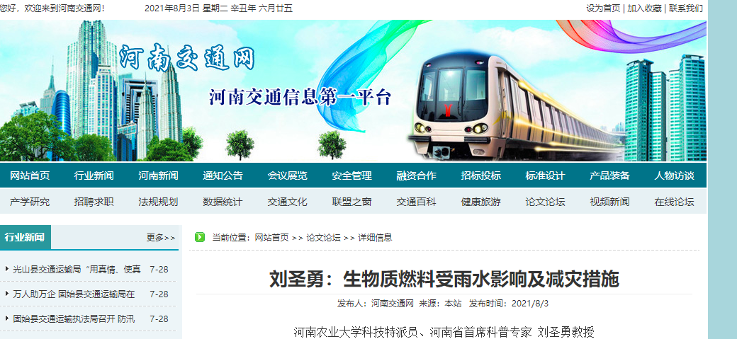 刘圣勇教授撰写的“生物质燃料受雨水影响及减灾措施”在“河南交通网”转载,指导降低灾后生物质燃料灾后损失。