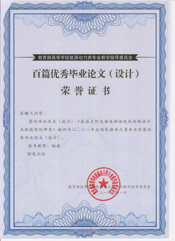 2021年6月,为促进兄弟院校在能源动力类专业本科毕业论文(设计)环节上的交流,提高毕业论文(设计)的质量,教育部高等学校能源动力类专业教学指导委员会决定开展“能源动力类专业全国优秀本科毕业论文(设计)在线展示交流活动”。面向能源与动力工程、能源与环境系统工程、新能源科学与工程、储能以及能源动力类的其他自设专业,以能源动力类专业应届本科毕业生人数的2%作为基本推荐名额,动力工程及工程热物理学科评估第四轮B+及以上的高校(17所),增加1个推荐名额。此次有清华大学,西安交通大学,上海交通大学、浙江大学、哈尔滨工业大学等83所高校的270篇优秀毕业论文作品推荐参评。经专家初评和复评,最终102件作品被遴选为第一届全国能源动力类专业百篇优秀本科毕业论文(设计)。