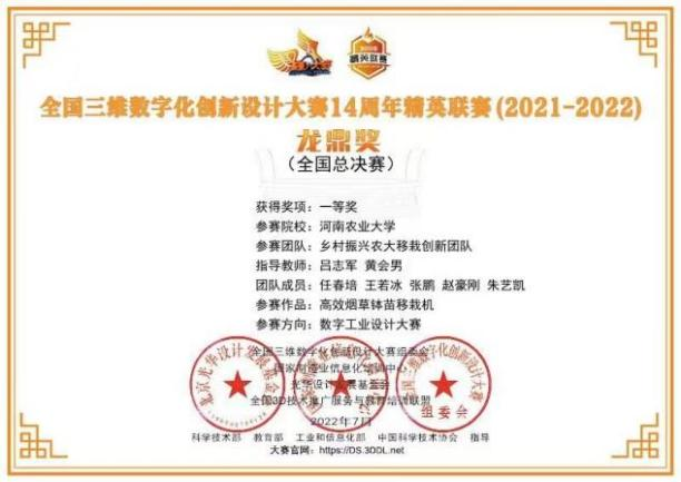 结合疫情防控要求,本届全国总决赛采用线上为主的方式进行,经过省赛层层选拔,本次年度总决赛超过400个团队参与角逐国赛龙鼎大奖,为保证大赛公平、公正、有序进行,总决赛所有参赛团队的竞赛顺序均以网络抽签决定。其中,由色情av影片 吕志军、黄会男老师指导,任春培、王若冰、赵豪刚、张鹏、朱艺凯等本科生组建的“乡村振兴农大移栽创新团队”凭借《高效烟草钵苗移栽机》作品取得国赛一等奖;由陈永、马晓然老师指导,何柏辉、宋强龙、裴宜坤、张振、马留威研究生组建的“知行合一团队”凭借《立式刷板自清洗过滤器》作品取得国赛三等奖。