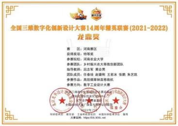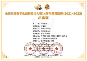 师生获省特等奖3项的好成绩。由吕志军、黄会男老师指导,任春培、王若冰、赵豪刚、张鹏、朱艺凯本科生组建的“乡村振兴农大移栽创新团队”凭借《高效烟草钵苗移栽机》作品取得省赛特等奖,由陈永、马晓然老师指导,何柏辉、宋强龙、裴宜坤、张振、马留威研究生组建的“知行合一团队”凭借《立式刷板自清洗过滤器》作品取得省赛特等奖,由李赫、杨自尚老师指导,刘家威、郭长乐、柴嘉君、史云辉、李昱岐研究生组建的“冠亚组团队”凭借《玉米大豆带状复合种植分带喷杆喷雾剂》作品取得省赛特等奖。