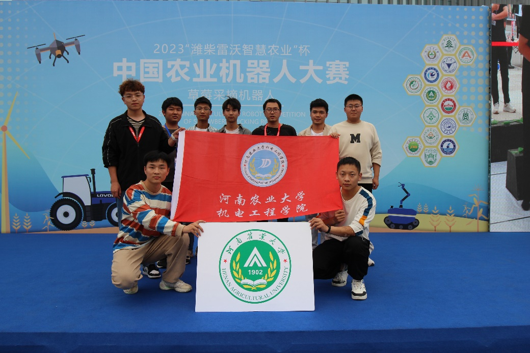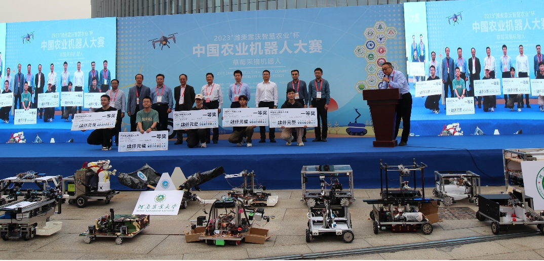 “HAU2”队(队员:李亚辉、董传鑫、李哲和梅超)设计的草莓采摘机器人采用垄上双边采摘策略,底层驱动部分使用高性能微控制器,以驱动机器人进行田间行走;果实识别部分采用自主研发的图像处理算法;果实采摘部分采用自主设计的多功能机械臂,末端搭载高精度的采摘执行机构;收集部分使用仿真软件设计出最优结构的草莓收集仓,以完成对草莓的临时仓储任务,荣获唯一的特等奖。“HAU1”队(队员:盛哲、许雪强、魏涛、徐欢和王有位)设计的草莓采摘机器人采用垄上双边采摘策略,搭载先进的图像识别系统,实现了自主巡线、垄对齐和垄上导航等一系列完整高效的自主视觉导航任务;同时,机器人采用基于视觉的机械臂伺服测控技术和基于机器学习的草莓自动识别技术,实现了对草莓的精准定位和高效采摘,荣获一等奖。“莓你不行”队(队员:王克震、申家宁、刘笑阳、李冠颉和李若石)设计的草莓采摘机器人采用独立设计的机械结构,采摘过程运用机械运动与智慧视觉相结合,对草莓进行精准采摘并放入侧边筐,实现了检测-采摘-收集一体化作业,荣获二等奖。