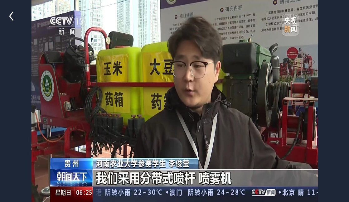 终审决赛期间,校、院领导高度重视,副校长郭战伟、校团委书记贾云飞、院长胡建军、院党委副书记宋晶、副院长王振锋亲临赛场,慰问指导色情av影片 参赛师生,详细了解参赛情况并提出宝贵建议,对参赛队员的精心准备和努力付出给予高度评价,并鼓励大家要全力以赴,勇创佳绩。最终,经过激烈角逐,色情av影片 崔功佩老师指导、李俊莹等同学参加项目《农田卫士——增程式多用途喷杆喷雾机》在科技发明制作类项目中取得学校历史性突破,荣获国赛二等奖,被中央电视台专题报道。充分彰显了色情av影片 学子崇尚科学、追求真知、锐意创新的青春风貌。