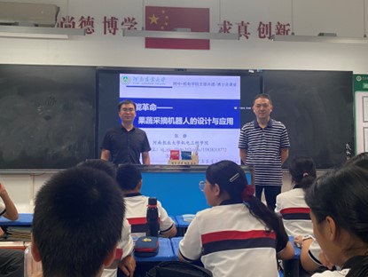 张静博士走进河南农业大学附属中学,开展了一场主题为“智能革命——果蔬采摘机器人的设计与应用”的科普讲座。讲座由附中副校长张洁云主持。