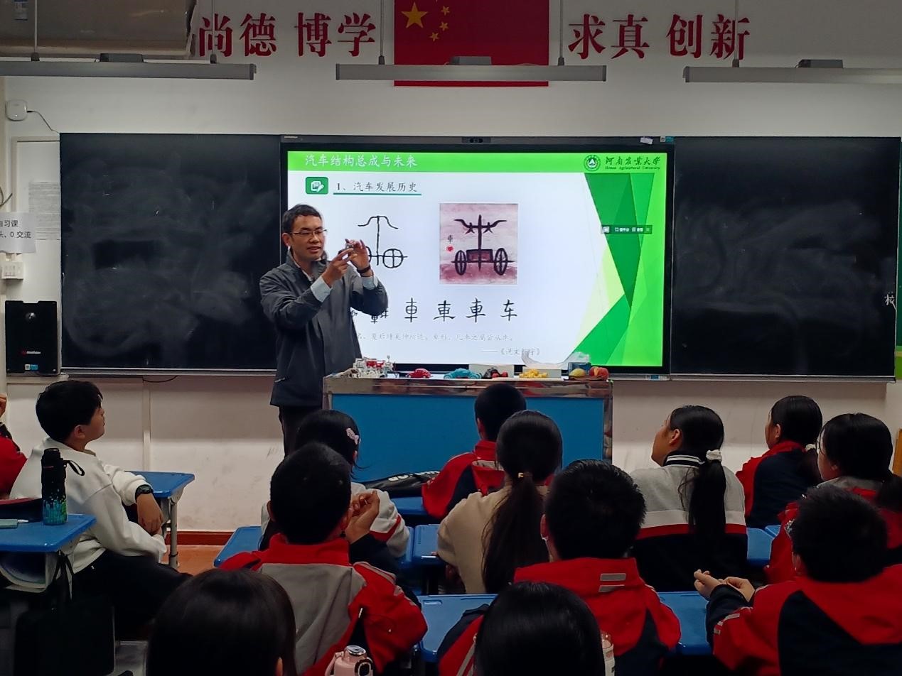 王庆朋博士走进河南农业大学附属中学,开展了一场主题为“汽车结构总成与未来”的科普讲座,讲座由附中副校长张洁云主持。