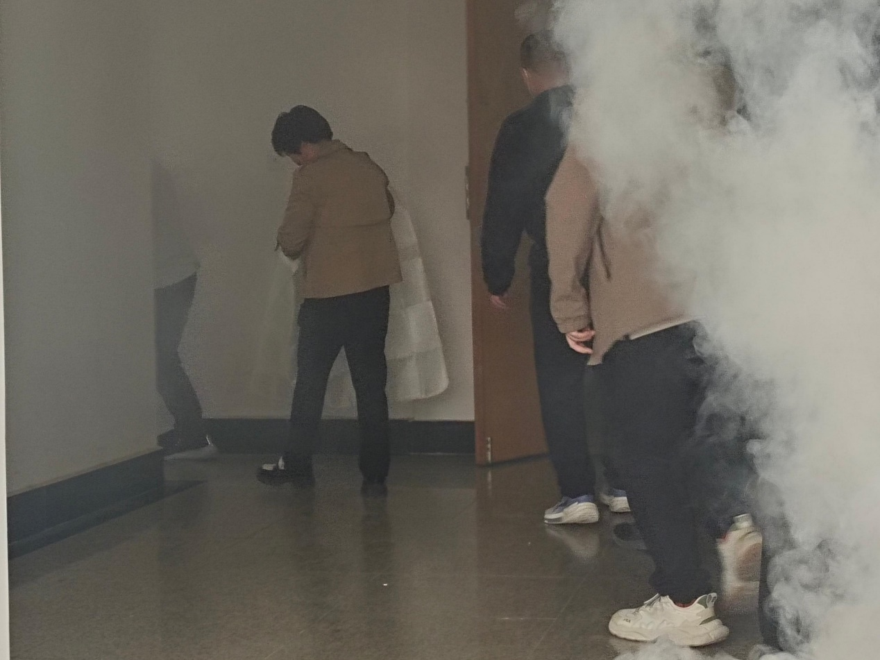 15时30分,演练正式开始。随着烟雾在楼道弥漫,学院消防专员立即拉响火情警报。各楼层片区负责人迅速就位,按照预案组织师生有序撤离。全体师生或佩戴防毒面具,或用湿毛巾捂住口鼻,弯腰低姿快速通过安全通道。东西两侧师生分别从露天楼梯和中部楼梯分流撤离,整个过程紧张有序。5分钟内,全体人员安全撤离至楼前集合点。随后,各片区负责人认真清点人数,确认无人员滞留。