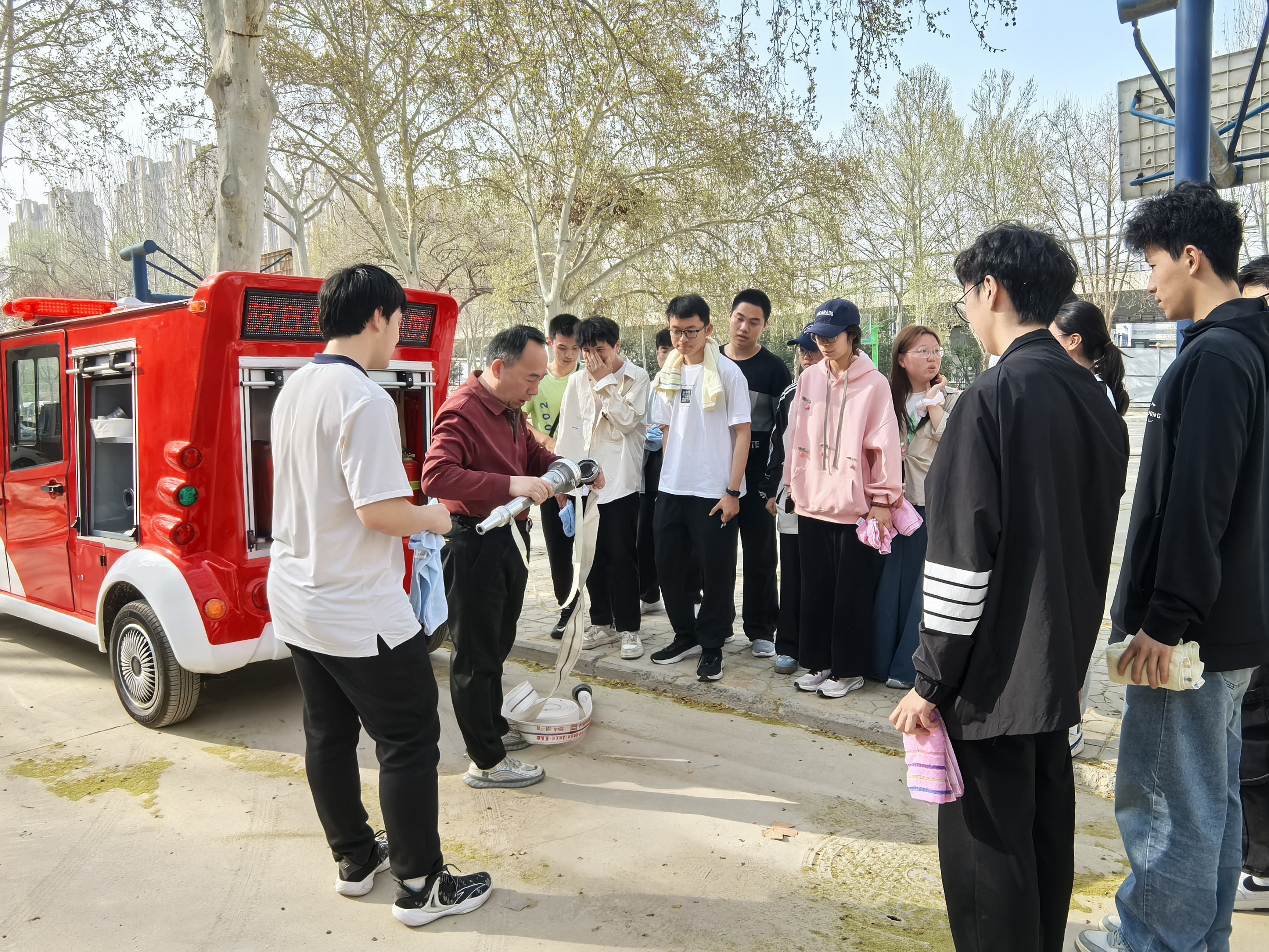 15时40分,全体师生转移至东篮球场进行灭火实操培训。保卫处消防员首先详细讲解并演示了灭火器的操作要领,随后师生分组进行实战演练,成功扑灭模拟火源。最后,消防员现场教学消防水龙带的使用方法,部分师生在指导下进行了实际操作。(图/文:李林泽 审核:刘淑杰)