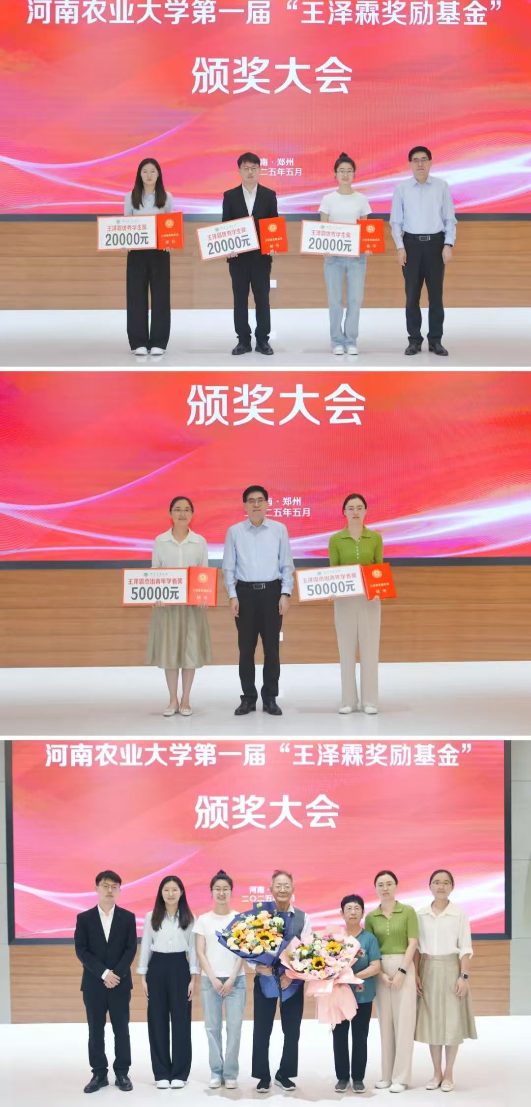 “王泽霖奖励基金”由河南农业大学杰出校友、著名动物疫病防控专家王泽霖教授捐赠设立,用于奖励为河南农业大学做出突出贡献并具有巨大发展潜力的青年教师和学业成绩优异并立志从事科学研究的学生。该基金下设“河南农业大学王泽霖杰出青年学者奖”和“河南农业大学王泽霖优秀学生奖”,每两年评选一次,一次评选教师、学生各1至3名。