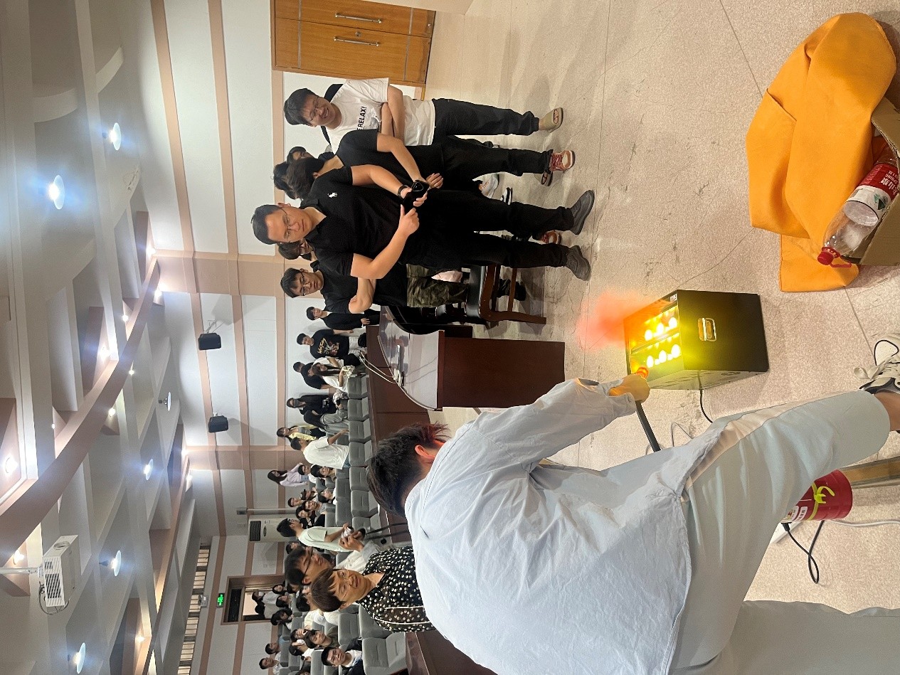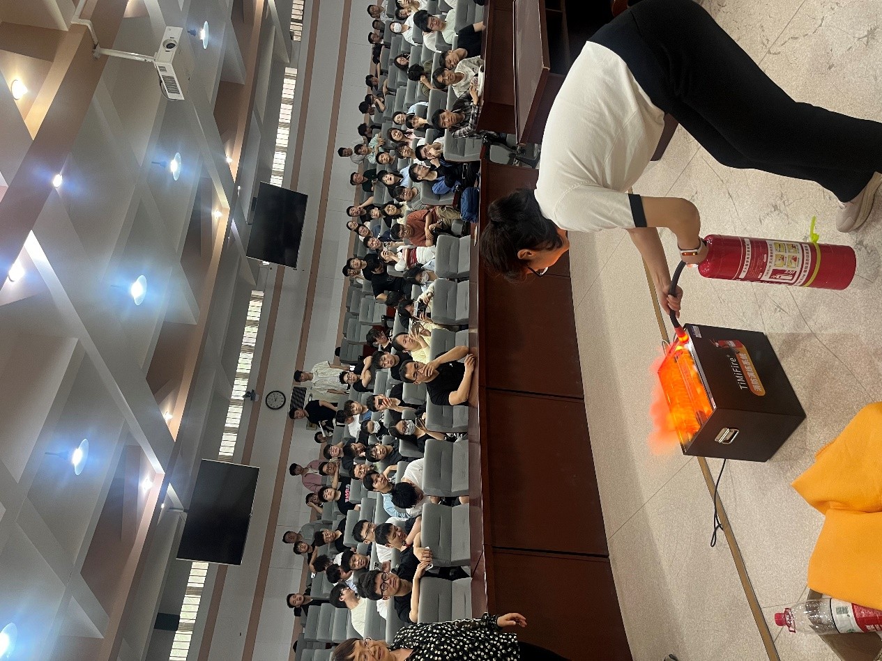 李林泽老师详细介绍了各类消防器材的使用方法和适用范围,借助TiMiFire仿真消防演练系统,让大家对灭火器、消火栓等消防设备有了更深入的了解,并在现场演示了灭火器的正确使用步骤:一提,即提起灭火器;二拔,即拔掉保险销;三握,即握住喷管前端;四压,即按下压把。随后,全体人员进行了虚拟灭火设备的实战演练。研究生和教职工先后依次上场,亲身体验了使用灭火器和灭火毯扑灭初期火灾的过程。