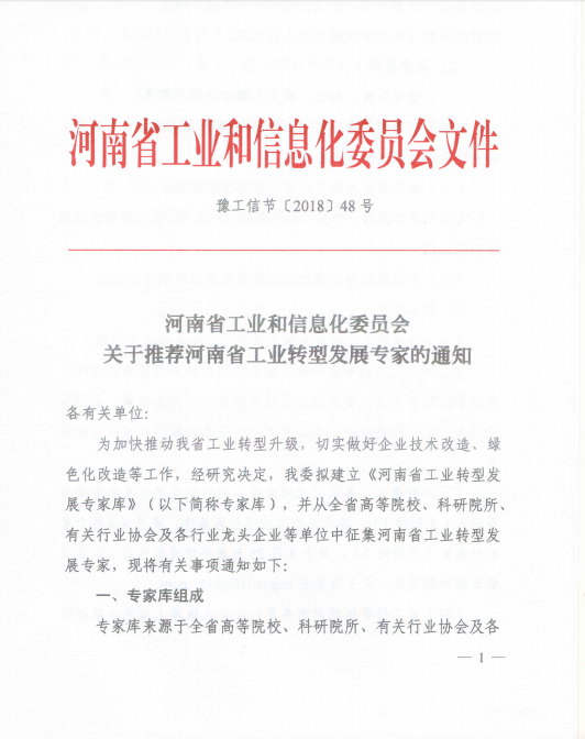 转发河南省工业和信息化委员会《关于推荐河南省工业转型发展专家的通知》的通知