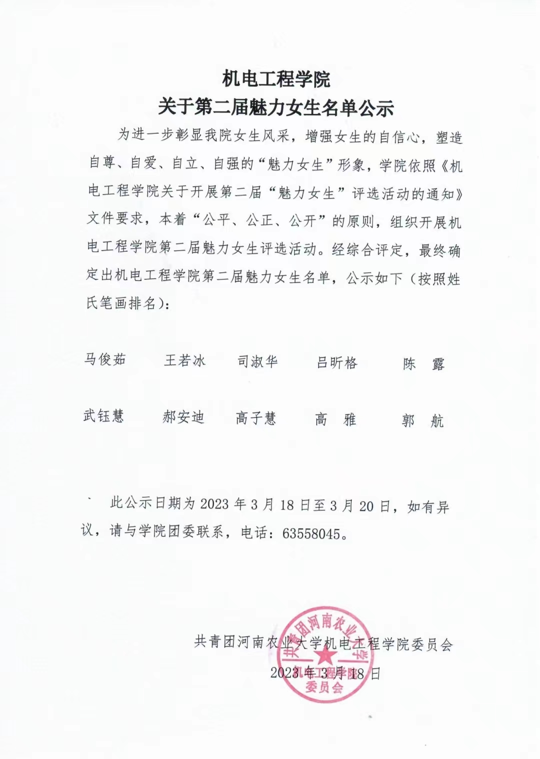 为进一步彰显色情av影片 女生风采,增强女生的自信心,塑造自尊、自爱、自立、自强的“魅力女生”形象,学院依照《色情av影片 关于开展第二届“魅力女生”评选活动的通知》文件要求,本着“公平、公正、公开”的原则,组织开展色情av影片 第二届魅力女生评选活动。经综合评定,最终确定出色情av影片 第二届魅力女生名单,公示如下(按照姓氏笔画排名):