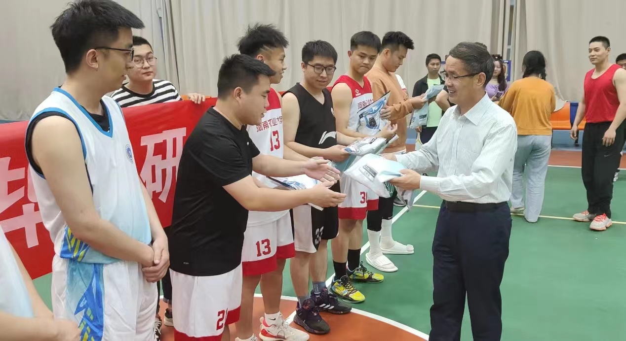 学院党委书记李世欣和副书记宋晶为毕业研究生篮球队颁奖,恭喜他们在这次比赛中取得好成绩,同时希望同学们继续保持对篮球的热爱,坚持运动,以顽强的意志、拼搏进取的精神面对未来的挑战,也祝愿同学们未来可期,前程似锦。随后师生友谊赛正式开始。教师队伍经验丰富、齐心协力,学生队伍有勇有谋、斗志昂扬。全场激情四射,意气风发,双方不分伯仲,驰骋赛场。最后,参赛人员还与裁判、观赛者进行了切磋,学习。