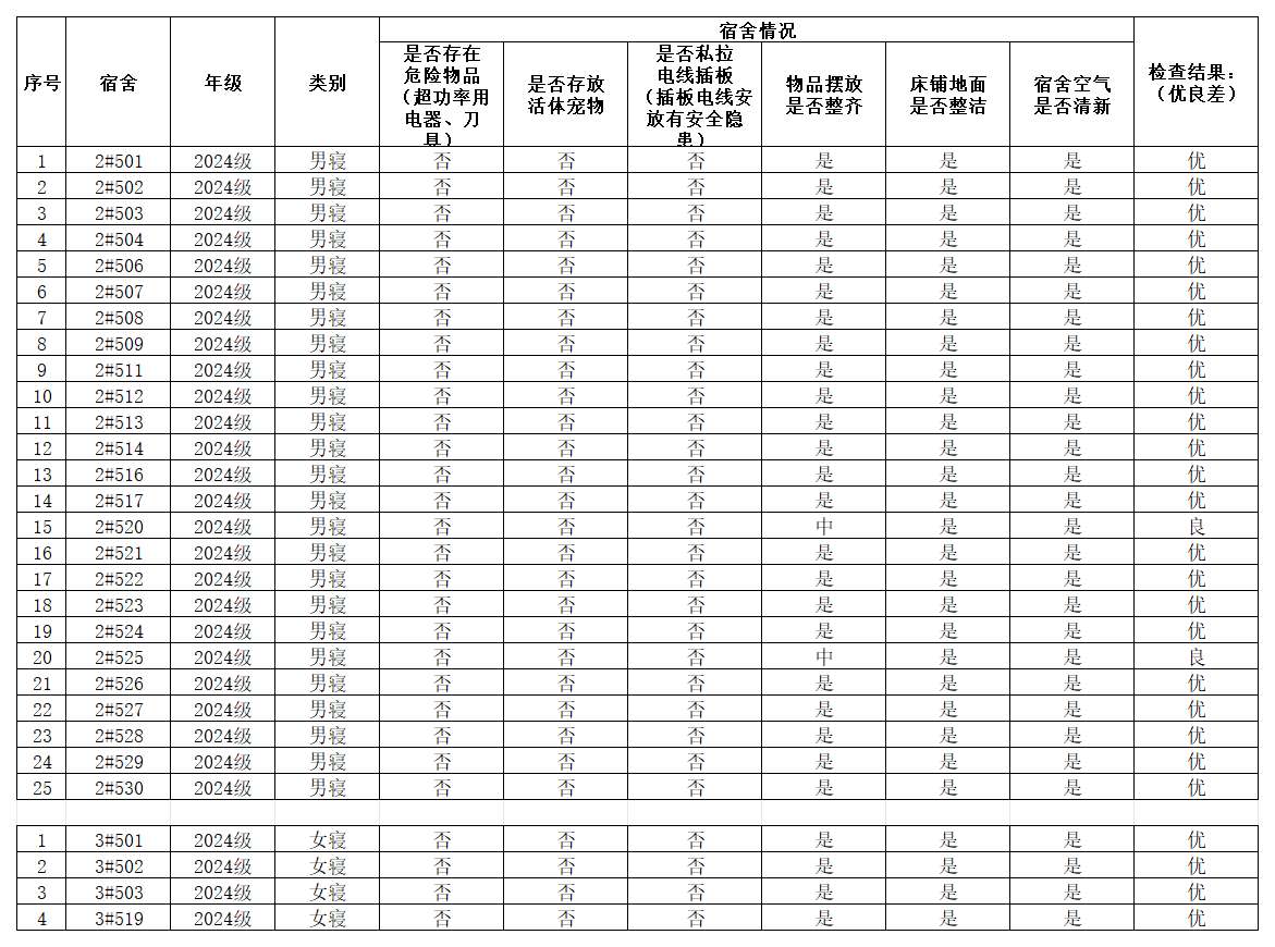 为加强色情av影片 宿舍安全文明建设,促进学生全面发展,引导同学营造健康文明、积极向上的生活环境,学院研究生会生活部对24级宿舍进行安全卫生检查,检查情况公示如下: