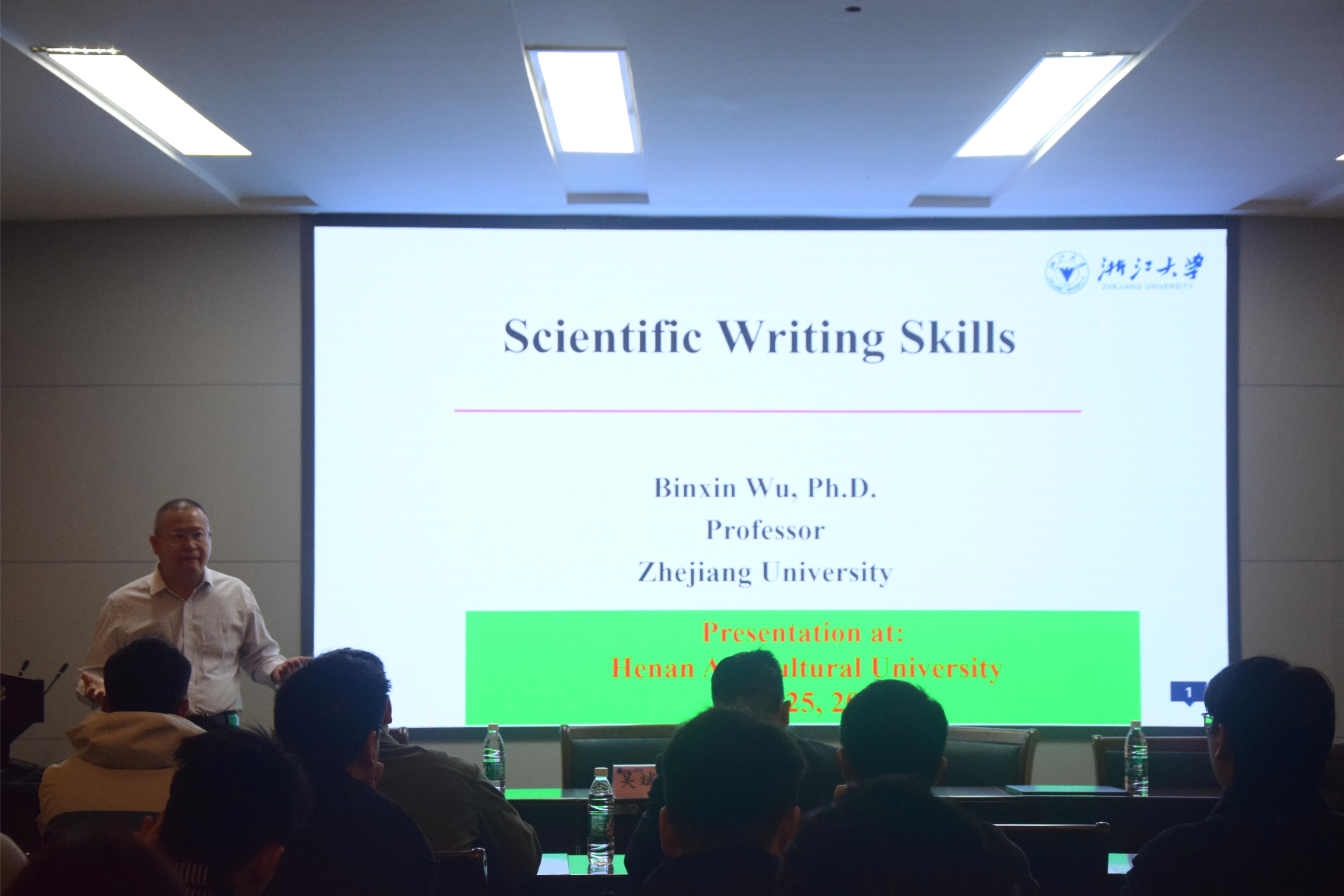 本次讲座中,吴教授为大家做了主题为“Scientific Writing Skills”的报告。他通过幽默风趣的语言,结合分析自己撰写的范例,为在场师生讲解了包括论文题目、论文内容、阐明实验结果的方法等几大内容。其中在分析论文内容要点的过程中,吴教授特别提到了尽量避免文章关键词部分出现与题目一致的词汇;擅用副词、连接词,保证文章的连贯性、可读性;文章要根据发布的地区选择使用英式英语或是美式英语,同时应保持文章语式统一。在谈到阐述实验结果的方法时,吴教授表示在文章中进行讨论时要让自己的实验结果与他人已发表的研究成果具有可比性,语言言简意赅,切忌陈词滥调。
