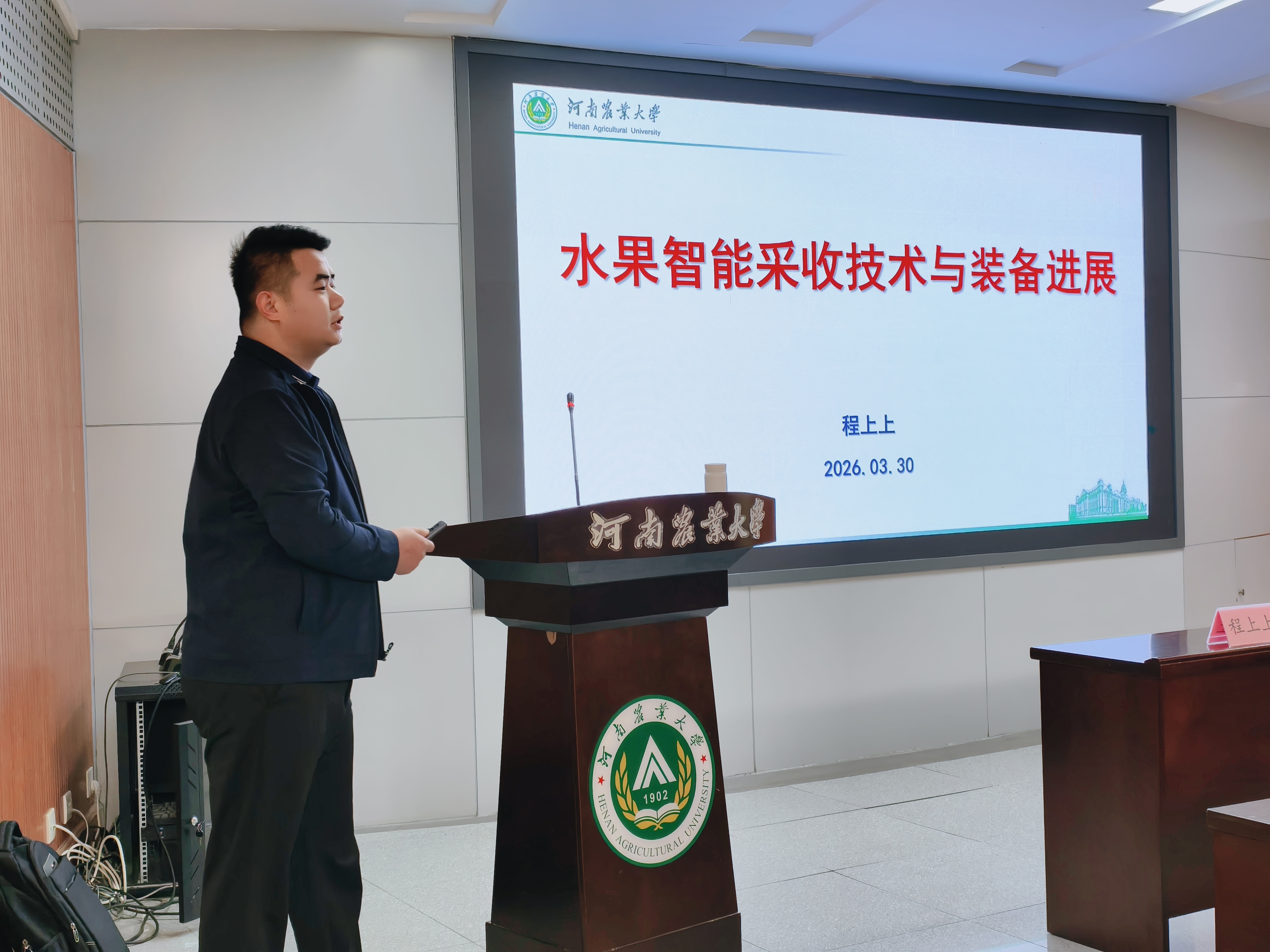 报告伊始,程上上老师围绕自身核心研究课题——“水果智能采收技术与装备进展”展开详细讲解。他结合自身科研经历,进行了全方位、深层次的分享。程老师重点介绍了水果智能采收装备的研发历程,讲解了如何结合实际生产需求,通过智能化技术提升采收作业的自动化、精准化水平,让同学们对科研与实际应用的结合有了更直观、深刻的认识。