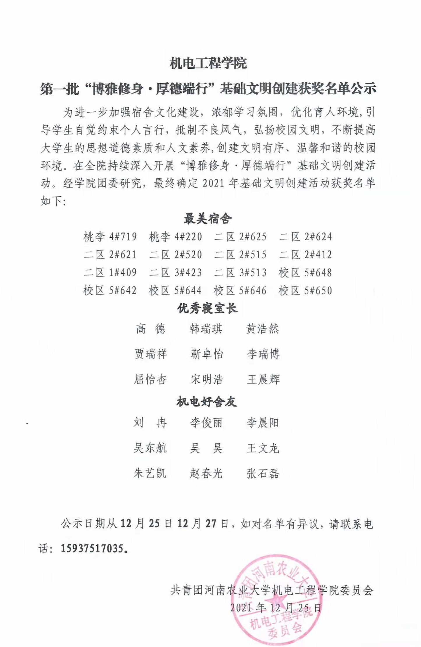 为进一步加强宿舍文化建设,浓郁学习氛围,优化育人环境,引导学生自觉约束个人言行,抵制不良风气,弘扬校园文明,不断提高大学生的思想道德素质和人文素养,创建文明有序、温馨和谐的校园环境。在全院持续深入开展“博雅修身·厚德端行”基础文明创建活动。经学院团委研究,最终确定2021年基础文明创建活动获奖名单如下:
