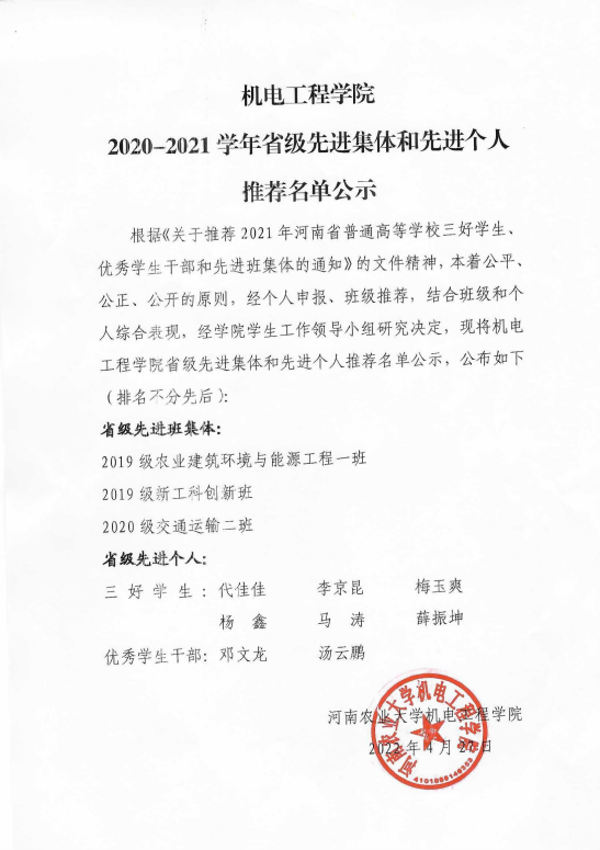 根据《关于推荐2021年河南省普通高等学校三好学生、优秀学生干部和先进班集体的通知》的文件精神,本着公平、公正、公开的原则,经个人申报、班级推荐,结合班级和个人综合表现,经学院学生工作领导小组研究决定,现将色情av影片 省级先进集体和先进个人推荐名单公示,公布如下(排序不分先后):