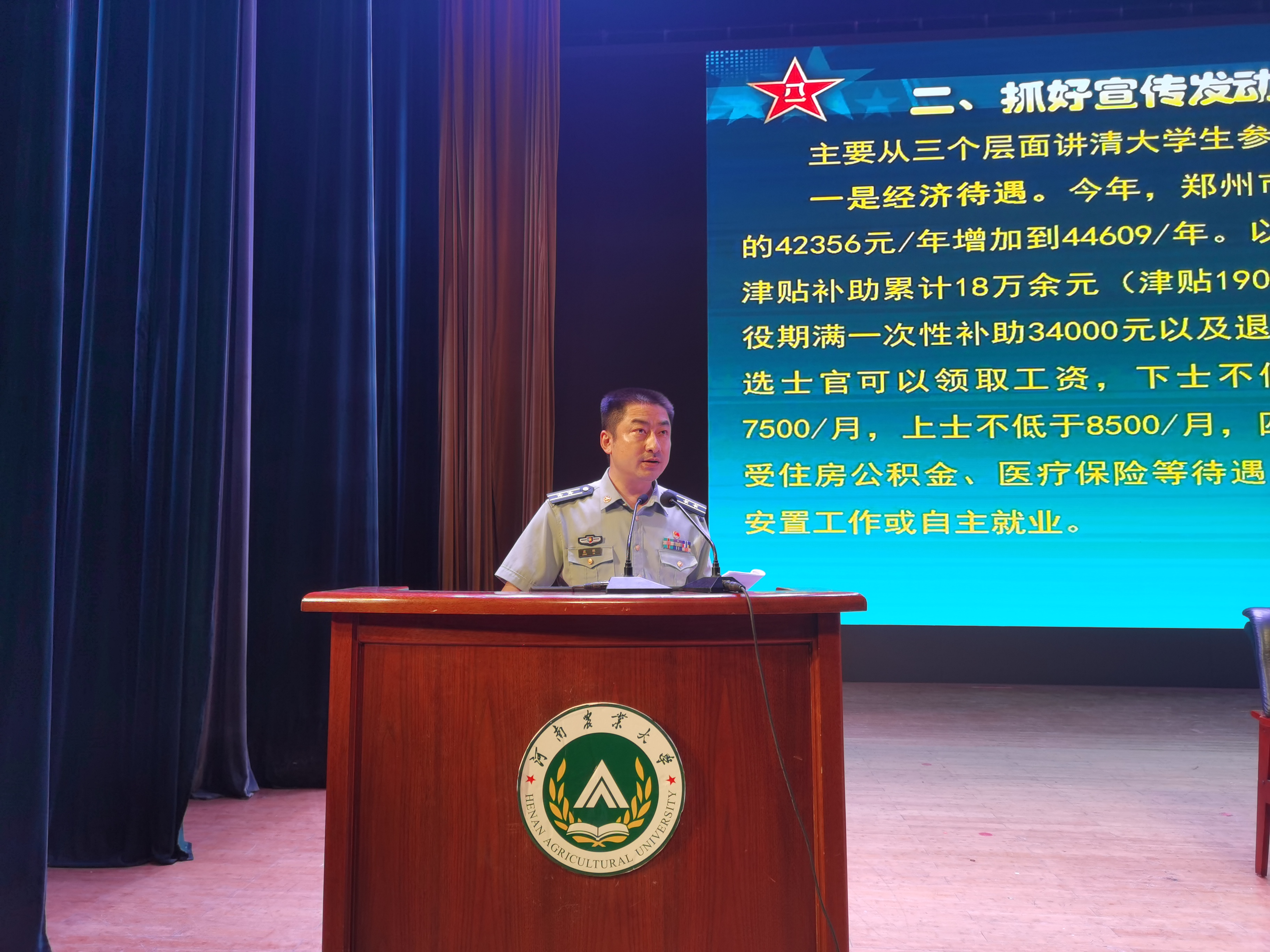 于文化路校区千人大礼堂隆重举行“让青春之花在军营绽放”河南农业大学2021年大学生征兵入伍动员宣讲大会。河南省军区郑州警备区金水区人民武装部部长刘岩、武装部副部长张林,校党委学工部副部长郭治鹏、院党委书记李世欣、学院98级校友、郑州市委宣传部新闻处副处长徐其华,学院99级校友、河南泰丰集团解俊杰,色情av影片