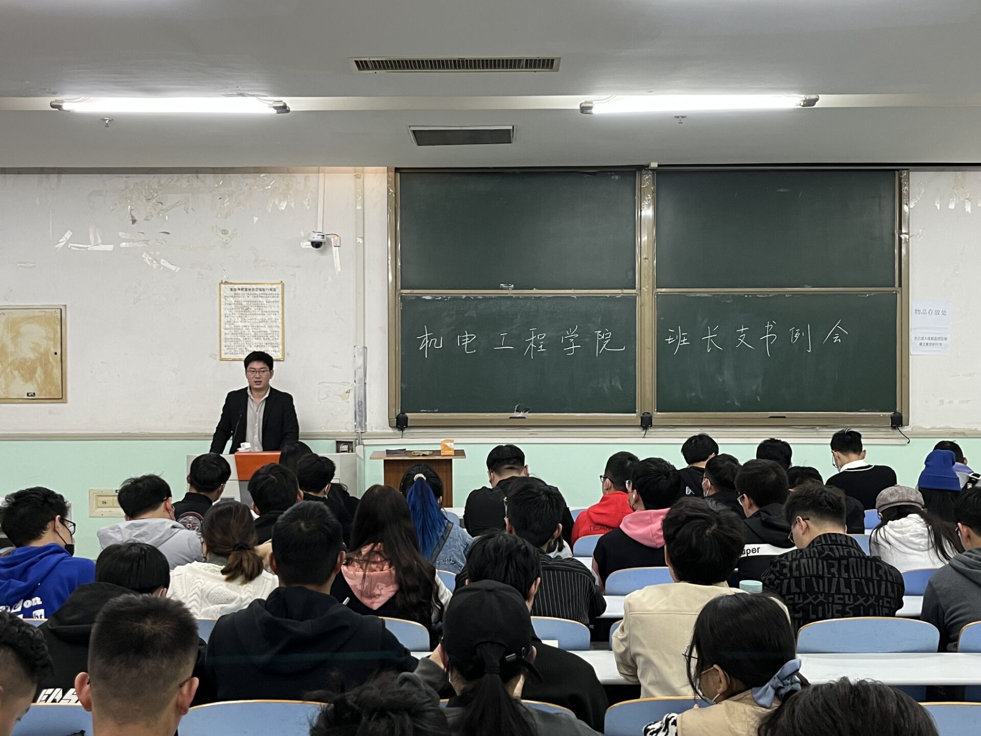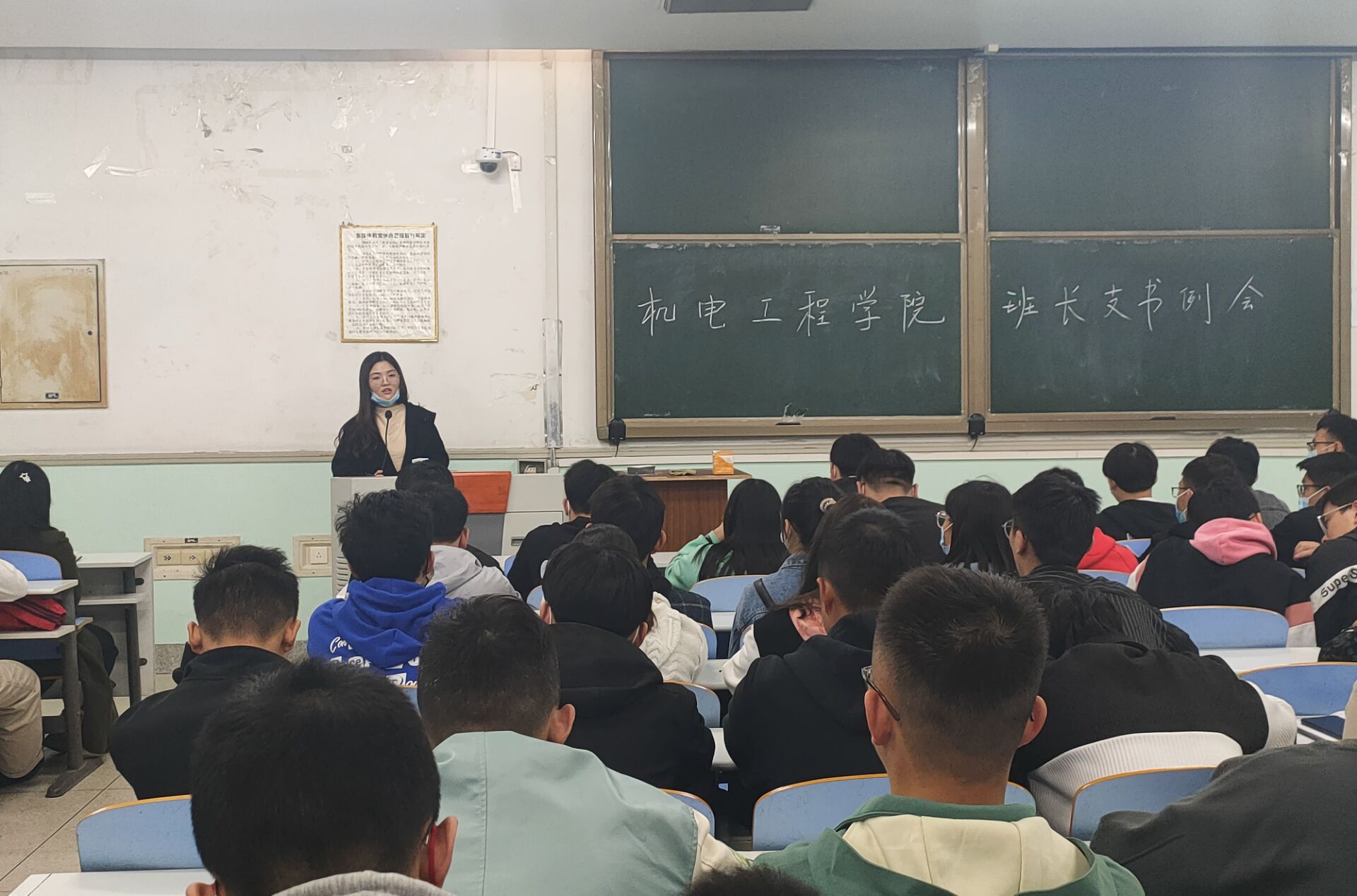 于文化路校区工程楼302教室召开新学期全体班长支书例会,院团委书记黄笑、团委副书记徐捧丽、辅导员胡亭亭出席本次会议,全体班长支书以及各新生助班参加会议。