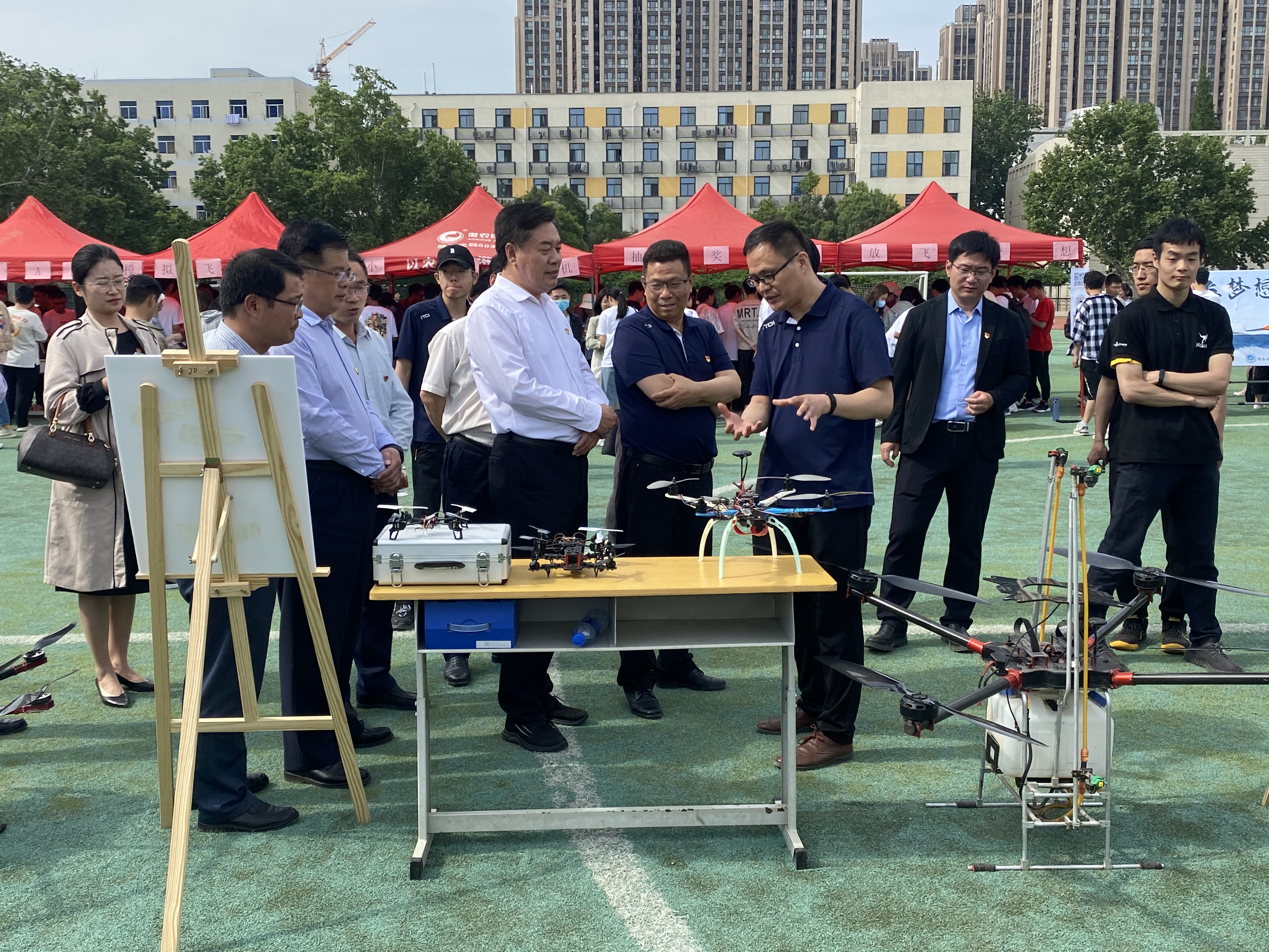 操场另一边的展区里,熙熙攘攘的人群中,是现场特地展览的50余架各类无人机实机,为了让广大师生对农用无人机有更直观的认识,学校还配备专人讲解,向师生普及无人机相关知识。细致入微而通俗易懂的讲解,吸引了大批同学驻足。为增加展出活动趣味性,展区内还设有模拟飞行体验、现场航拍体验、感应飞行器体验、放飞梦想和展望未来等多项趣味互动活动,现场一片欢声笑语,喜气洋洋。
