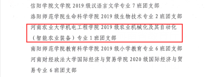 近日,共青团河南省委公布了2022年度“活力杯”河南学校共青团基层基础工作大赛获奖名单,本次大赛共有1074个共青团工作项目,442个微团课,427名团支书和395个团支部参赛,其中,色情av影片 2019级农业机械化及其自动化(智能农业装备)1班团支部书记郭滨恺荣获河南学校共青团十佳“魅力团支书”;2019级农业机械化及其自动化(智能农业装备)1班团支部荣获百优“活力团支部”。
