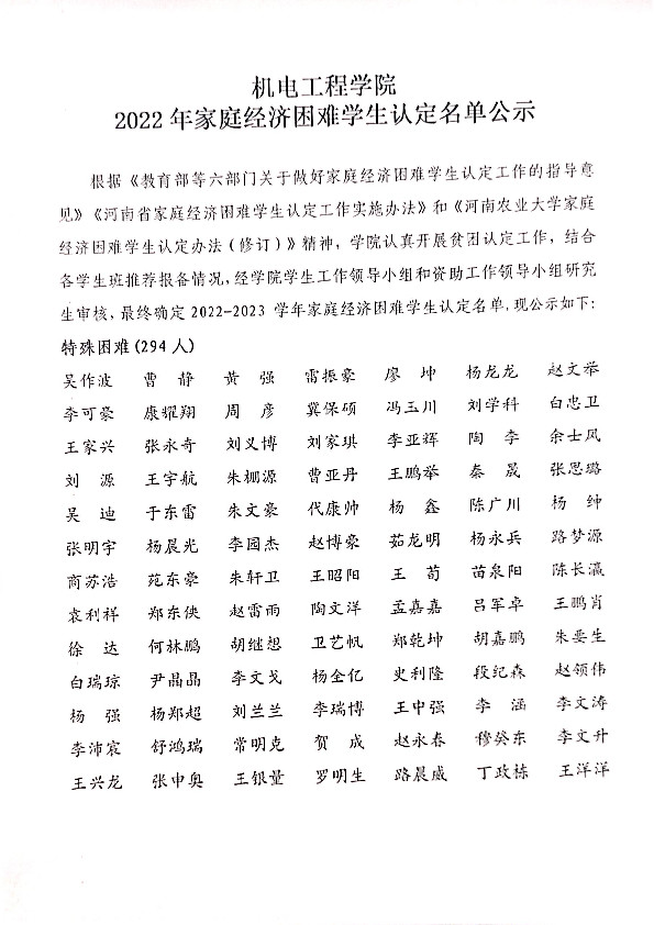 根据《教育部等六部门关于做好家庭经济困难学生认定工作的指导意见》《河南省家庭经济困难学生认定工作实施办法》和《河南农业大学家庭经济困难学生认定办法(修订)》精神,学院认真开展贫困认定工作,结合各学生班推荐报备情况,经学院学生工作领导小组和资助工作领导小组研究生审核,最终确定2022-2023 学年家庭经济困难学生认定名单,现公示如下: