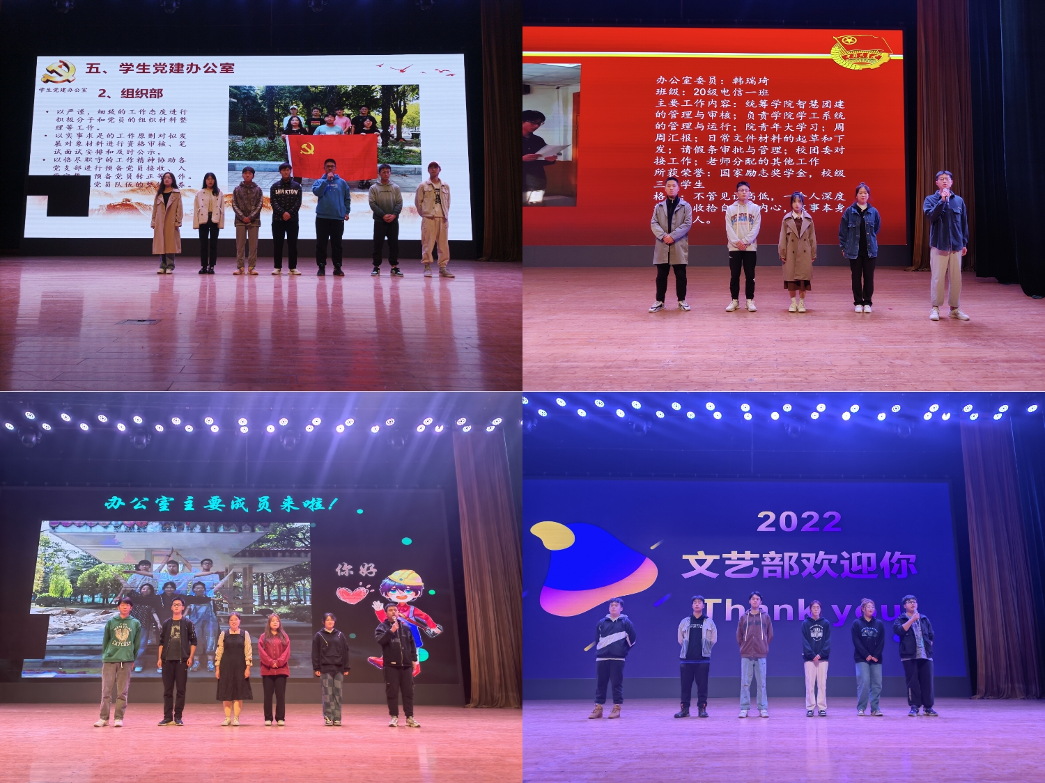 本次见面会以党建、团委、红色火炬工作室、学生会的顺序依次进行介绍。会上,各个学生组织负责人结合视频和PPT,首先就部门简介、日常工作、部门特色等内容进行了详细的介绍。随后,各组织部门负责人细致地为新生讲解了本部门的工作组成、成员结构、部门职能等,并真诚地欢迎每一位新同学的加入。活动现场反响热烈,各部门精彩纷呈的介绍和分享不仅使2022级新生对各部门有了更充分的了解,更将现场气氛逐步推向了高潮。