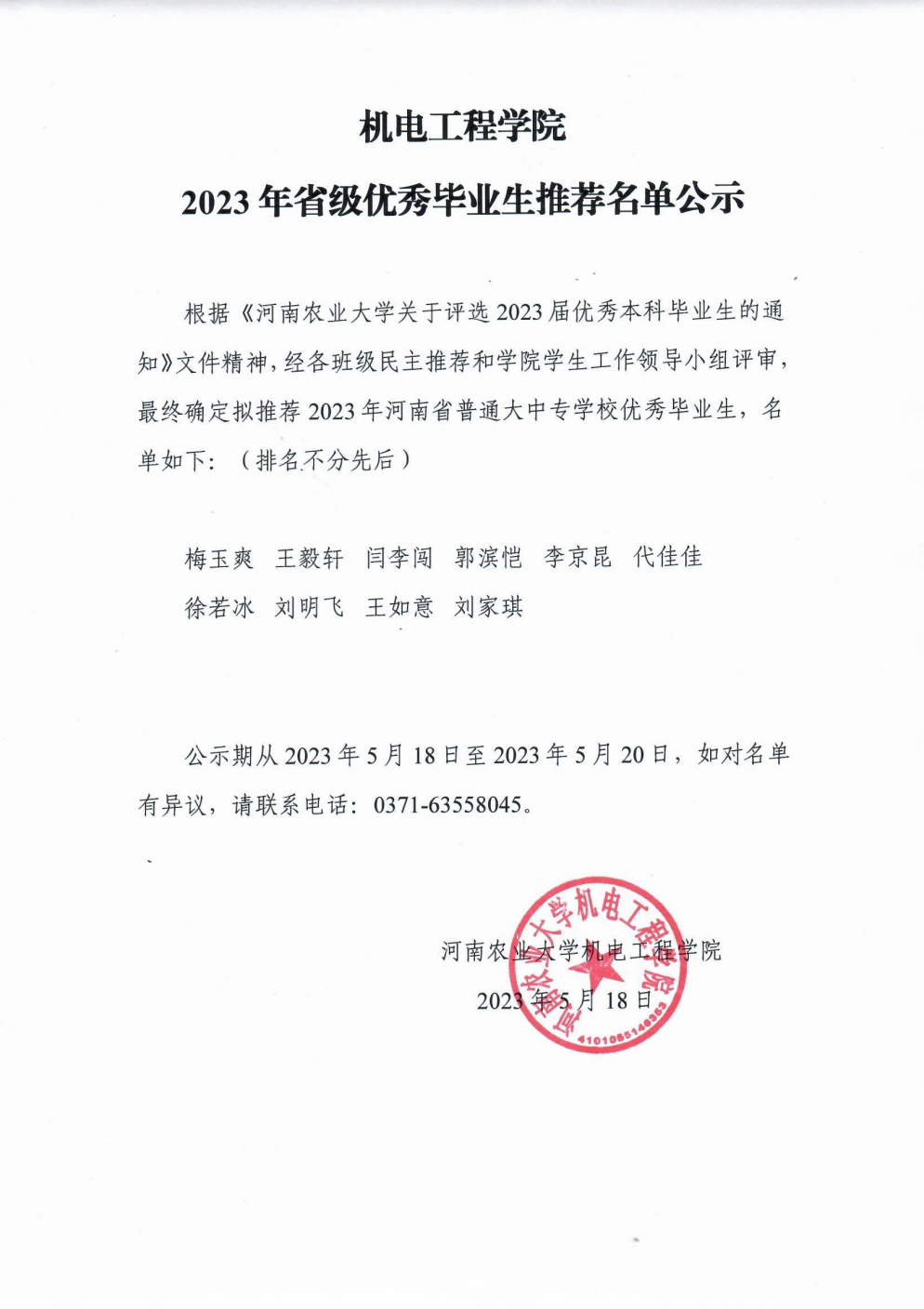 根据《河南农业大学关于评选 2023 届优秀本科毕业生的通知》文件精神,经各班级民主推荐和学院学生工作领导小组评审最终确定拟推荐 2023 年河南省普通大中专学校优秀毕业生,名单如下:(排名不分先后 )