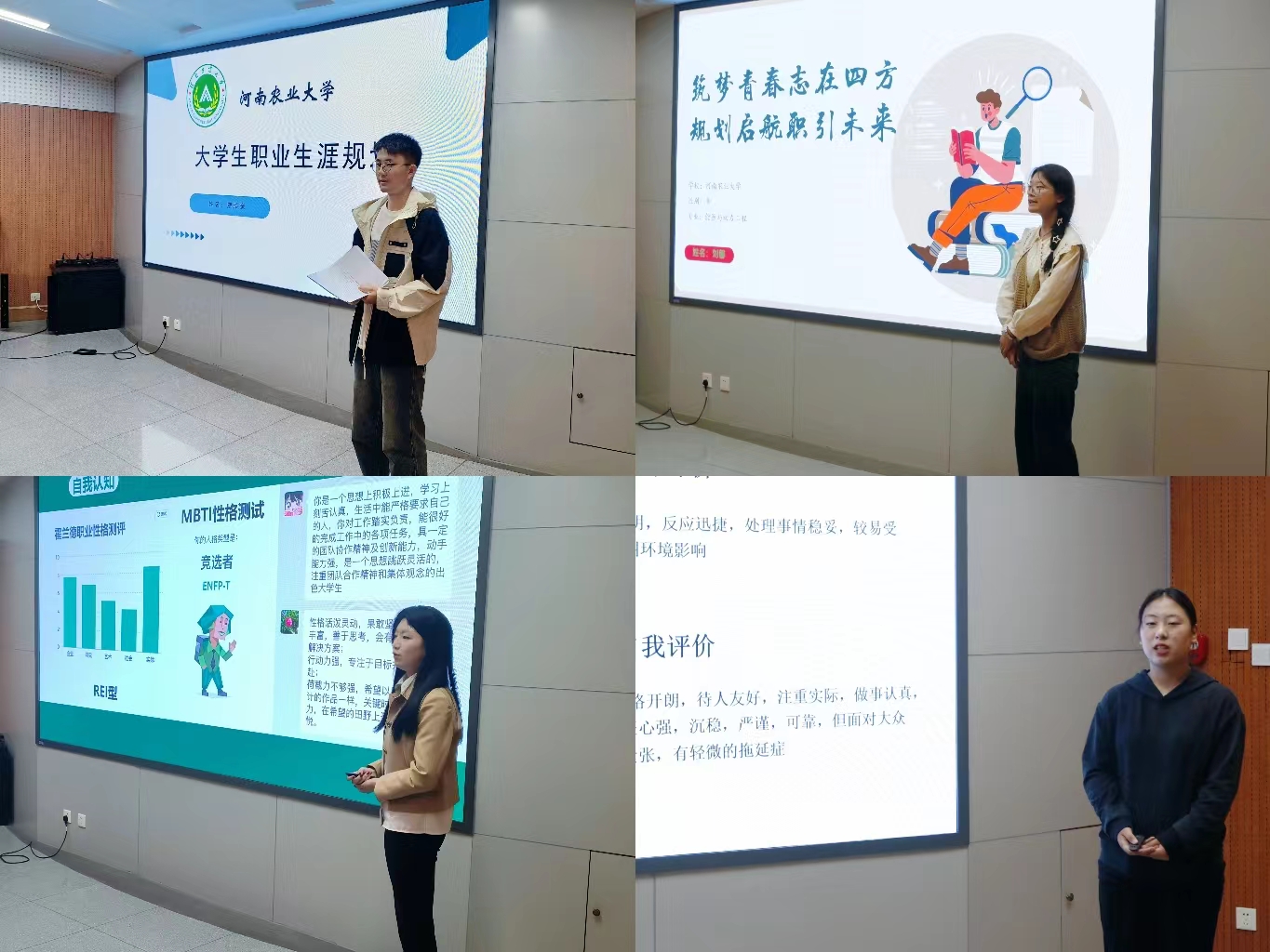 参赛选手依次上台,结合PPT从自我认知、职业探索、执行计划等方面阐述自己的职业规划,用清晰深入的分析和激情饱满的演讲展示自己的未来之路。