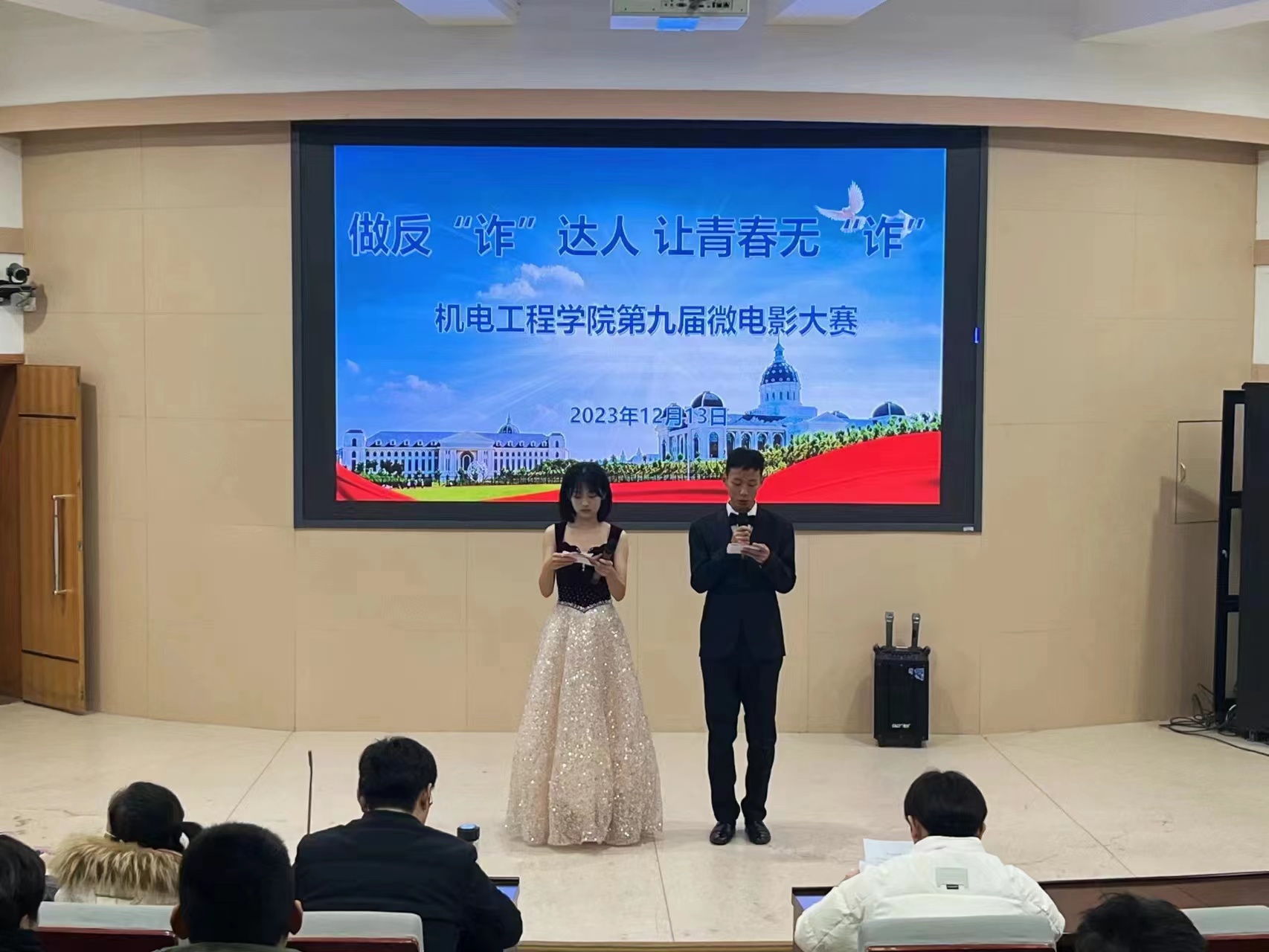 大赛伊始,黄笑首先对本次微电影大赛的选题表示肯定,指出其紧跟时代热点,有助于进一步提高同学们的防诈意识。随后强调微电影大赛能够增强同学们的创新意识,锻炼同学们的创新能力,并鼓励同学们主动参与学院各项活动,明确理想目标,丰富校园生活,演绎精彩人生。