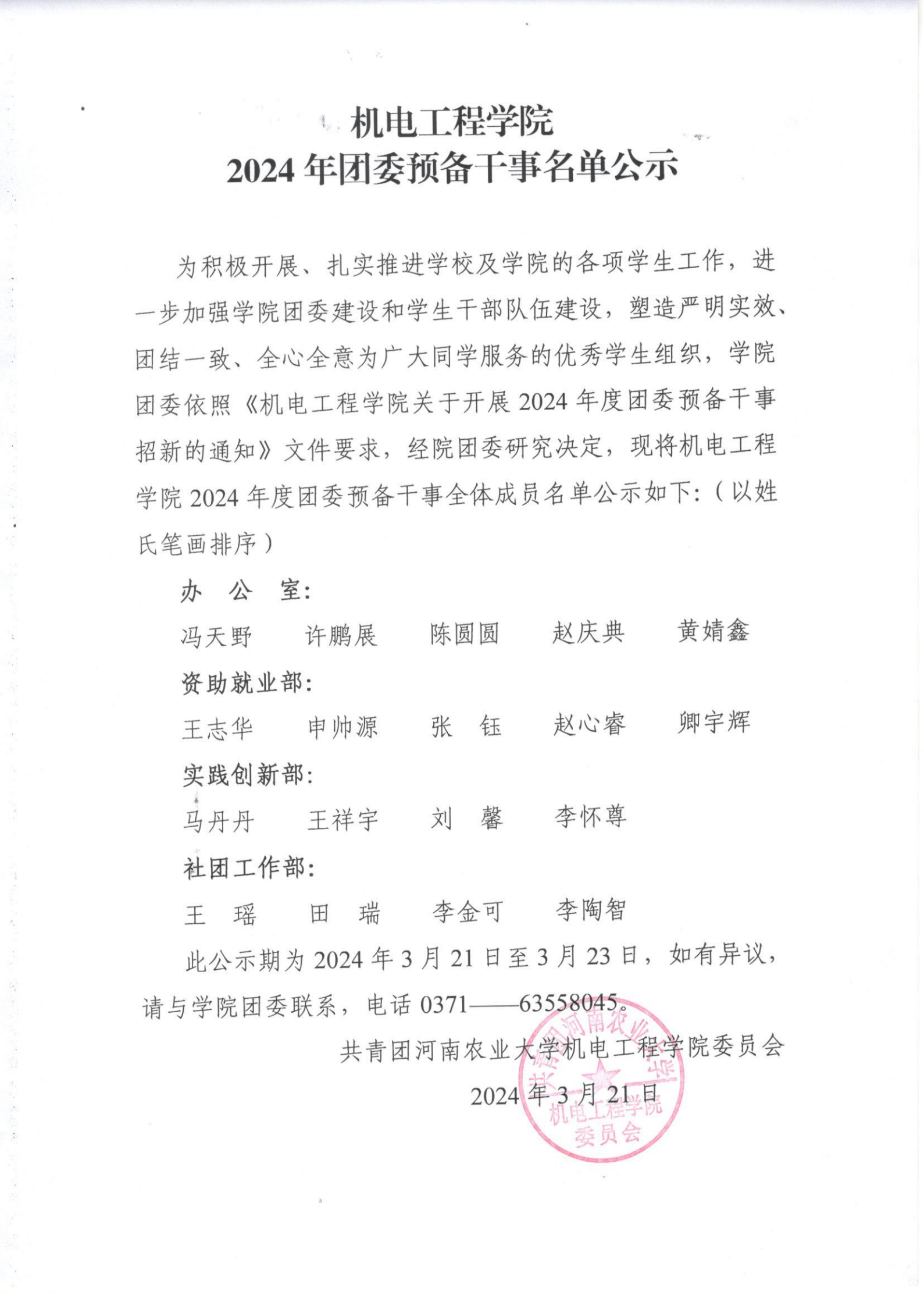 为积极开展、扎实推进学校及学院的各项学生工作,进一步加强学院团委建设和学生干部队伍建设,塑造严明实效、团结一致、全心全意为广大同学服务的优秀学生组织,学院团委依照《色情av影片 关于开展2024年度团委预备干事招新的通知》文件要求,经院团委研究决定,现将色情av影片 2024年度团委预备干事全体成员名单公示如下:(以姓氏笔画排序)