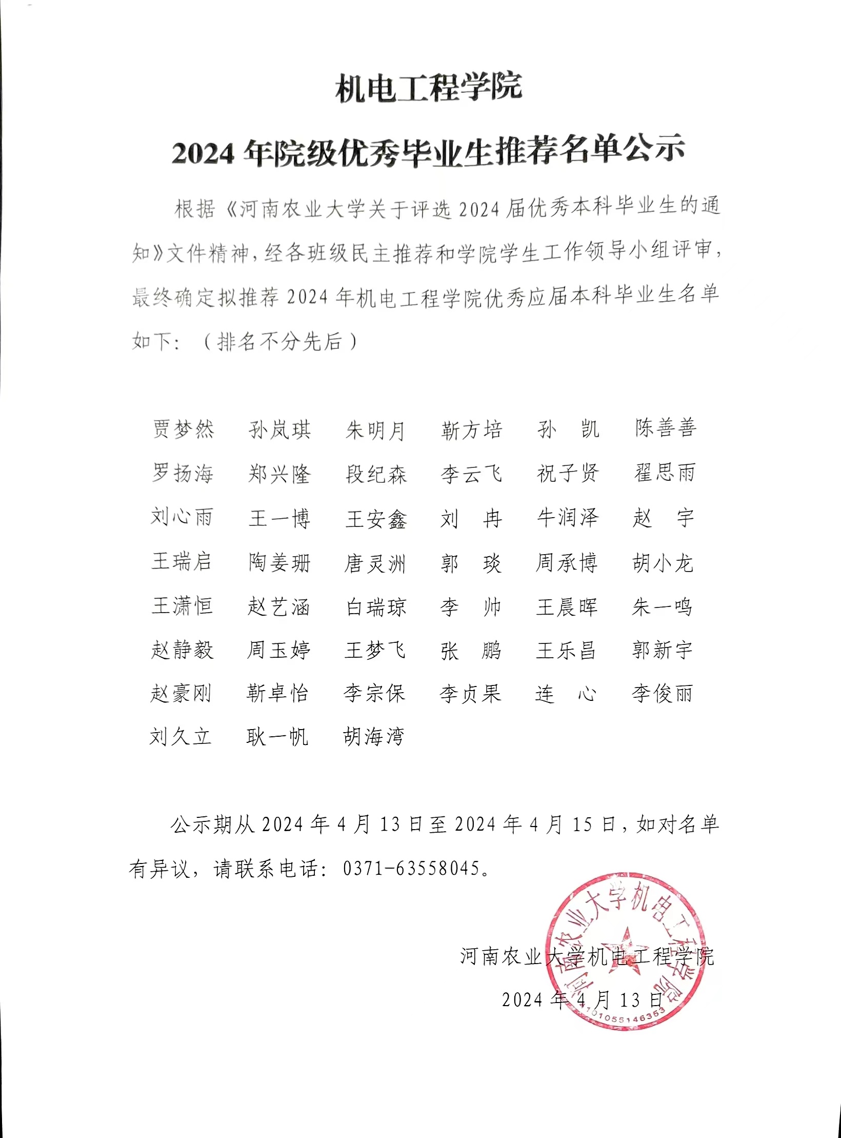 根据《河南农业大学关于评选2024届优秀本科毕业生的通知》文件精神,经各班级民主推荐和学院学生工作领导小组评审,最终确定拟推荐2024年色情av影片 优秀应届本科毕业生名单如下:(排名不分先后)