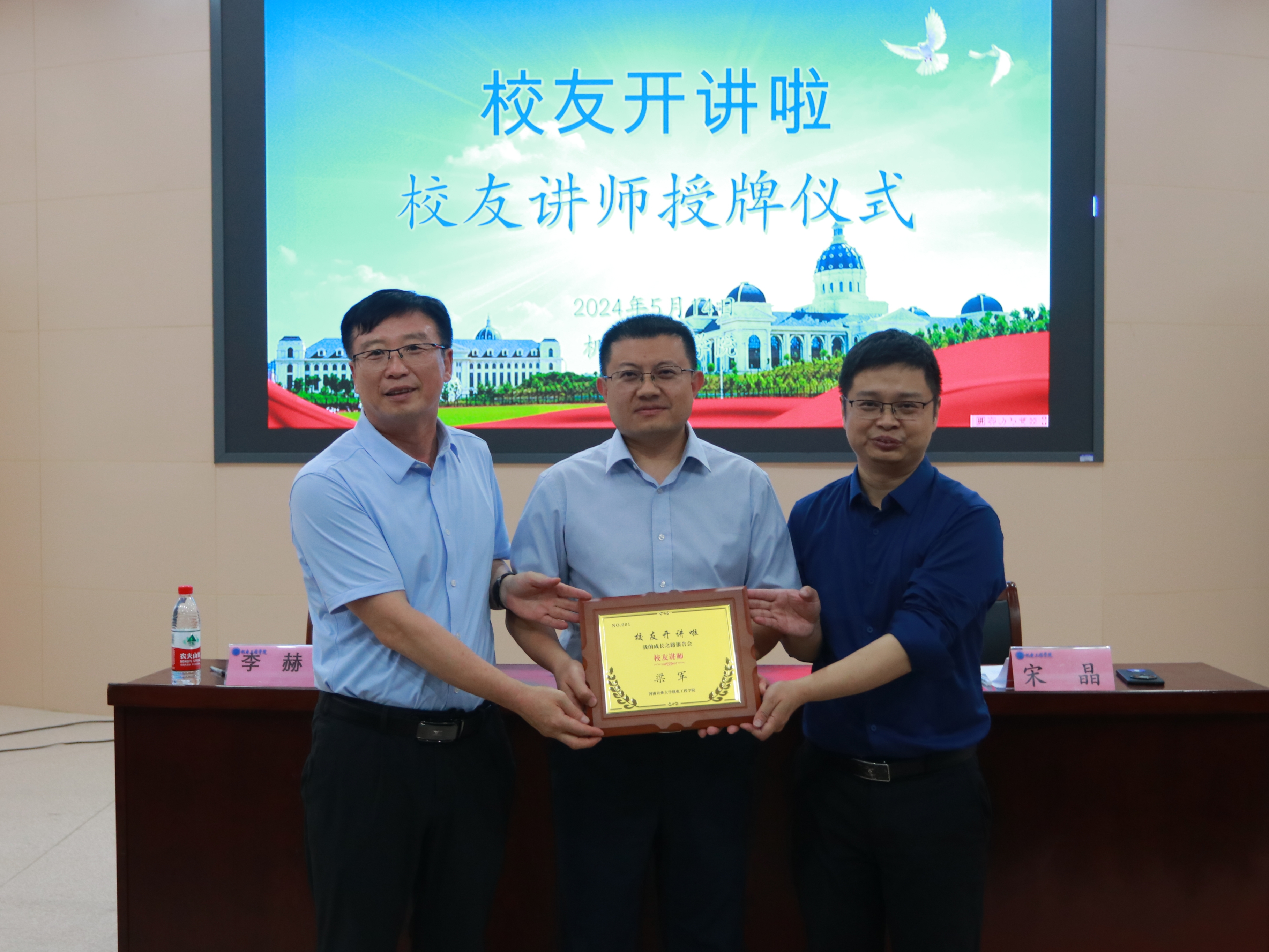 宋晶代表学院向梁军授予“校友讲师”牌匾。