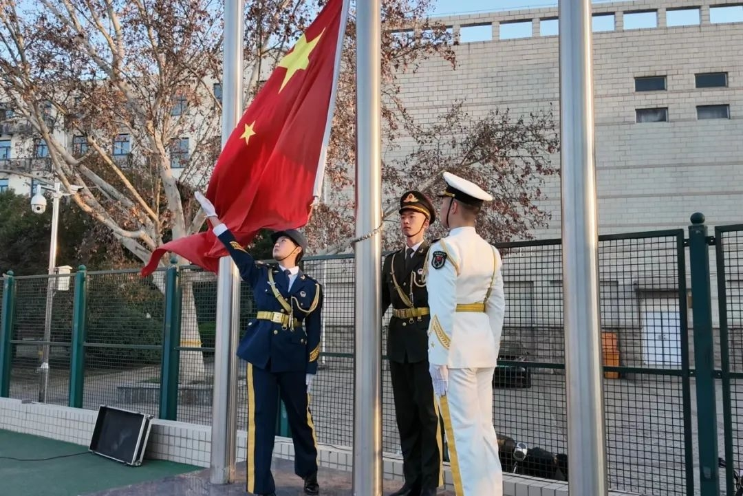 仪式在庄严的氛围中拉开帷幕,国旗护卫队迈着整齐有力的步伐护送国旗走向升旗台,伴随着激昂的国歌声,五星红旗缓缓升起,全体师生庄严肃立,向国旗行注目礼。