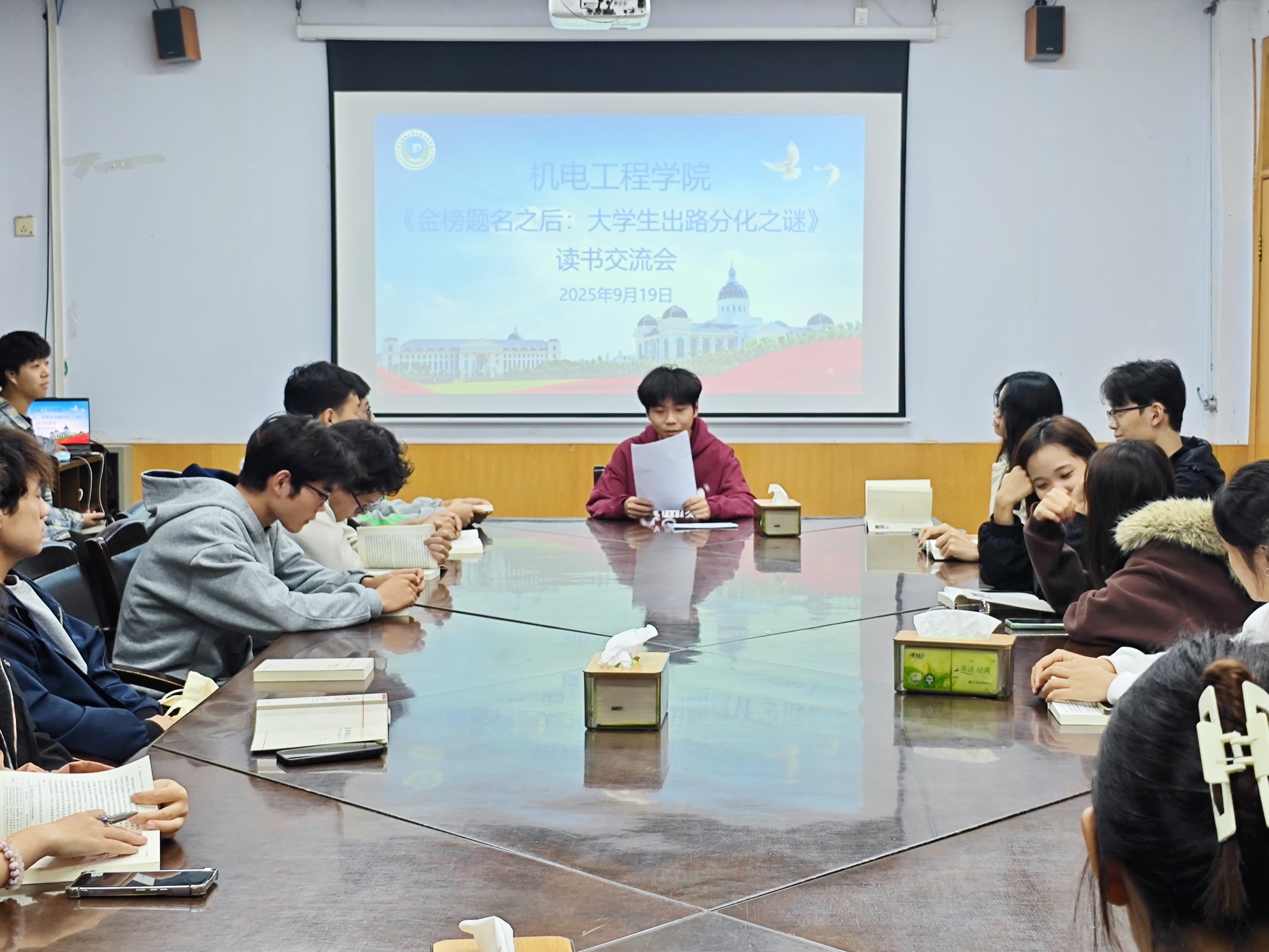 于文化路校区15号楼二楼会议室举办第七期《金榜题名之后:大学生出路分化之谜》读书交流会。本次活动由心农协会组织并主持,院党委副书记宋晶、年级辅导员梁凯凯出席会议,24级各班班级代表参加。