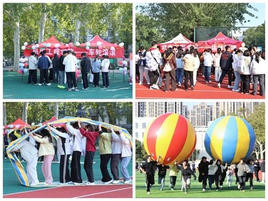 承办的两大项目现场热闹非凡。“运转乾坤”区域,团队合力推动巨型充气球,在协作中锤炼默契、释放学业压力;“车轮滚滚”区域,同学们脚踩“风火轮”默契同步,于稳步前行中拉近心距、打破隔阂,在欢声笑语里舒缓身心。
