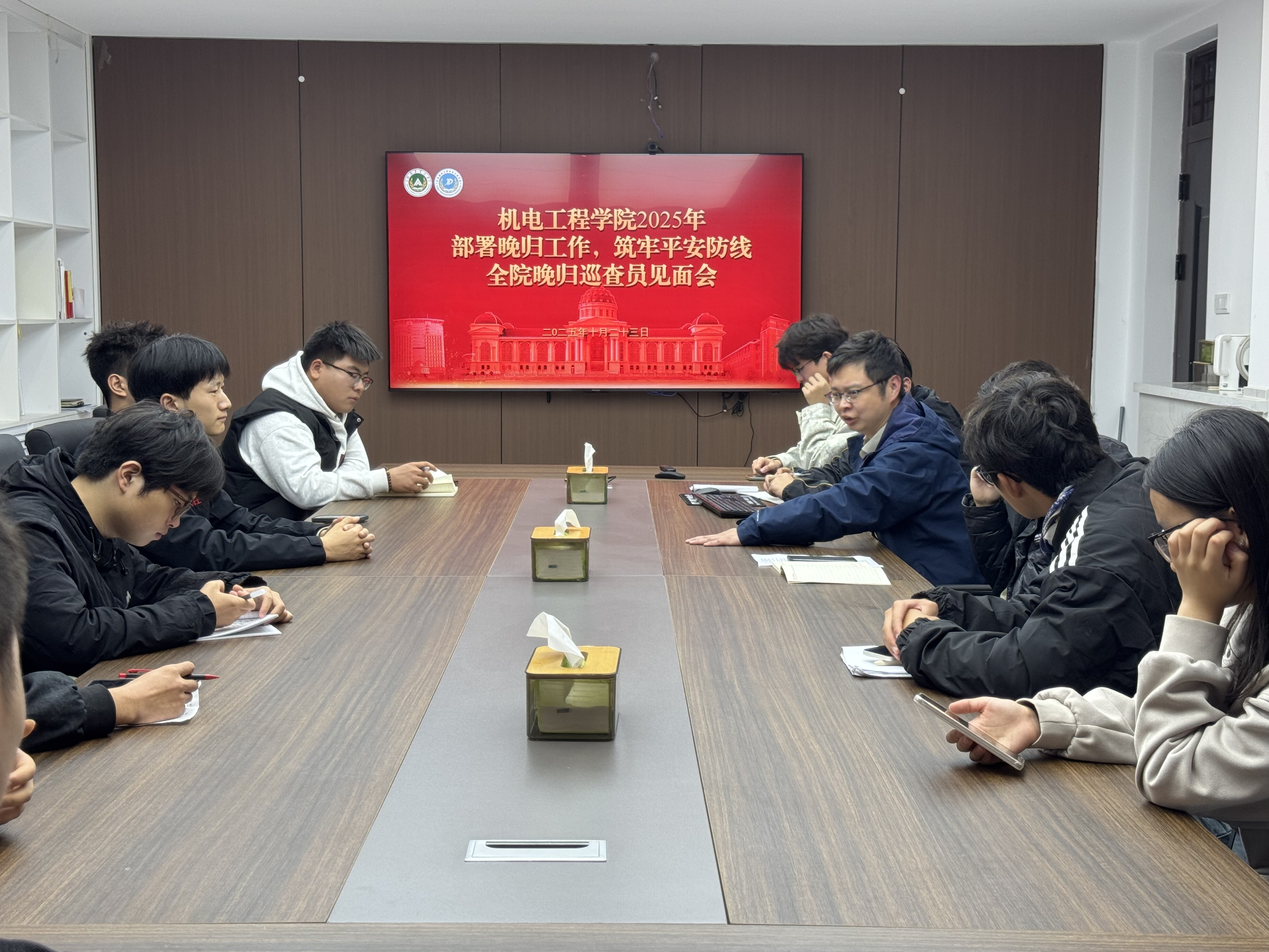 召开“部署晚归工作,筑牢平安防线”晚归巡查员见面会,院党委副书记宋晶、年级辅导员梁凯凯、生保部成员及全体巡查员参会。
