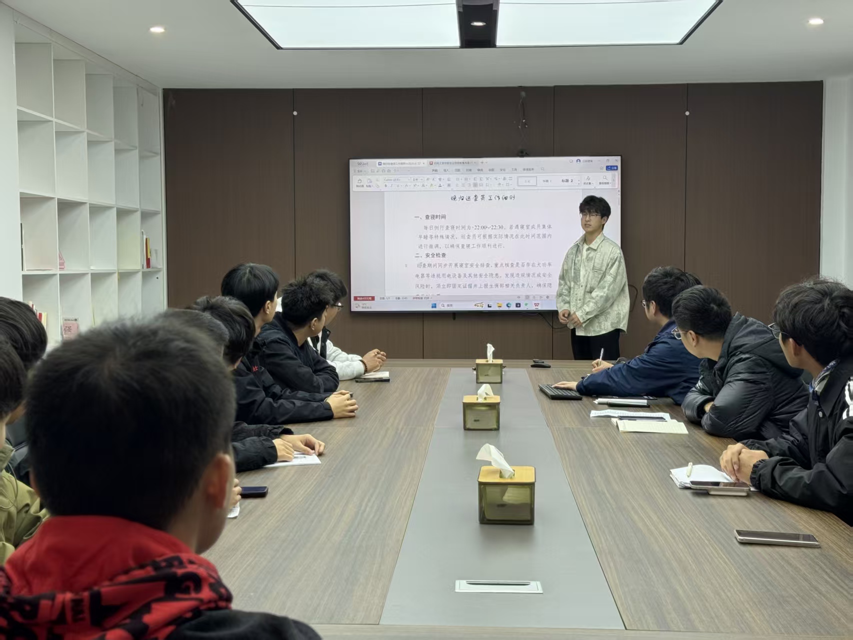 会上,生保部成员首先对晚归巡查的基础规范进行讲解:明确巡查时间为每日22:00-22:30,核心任务包含晚归人员核查(补签需拍摄半身照、严禁作假)、大功率电器等安全隐患排查;同时强调巡查员纪律要求,并针对补签混乱、巡查员缺位等现存问题,讨论了优化流程、多图拍照、及时上报等解决方案。