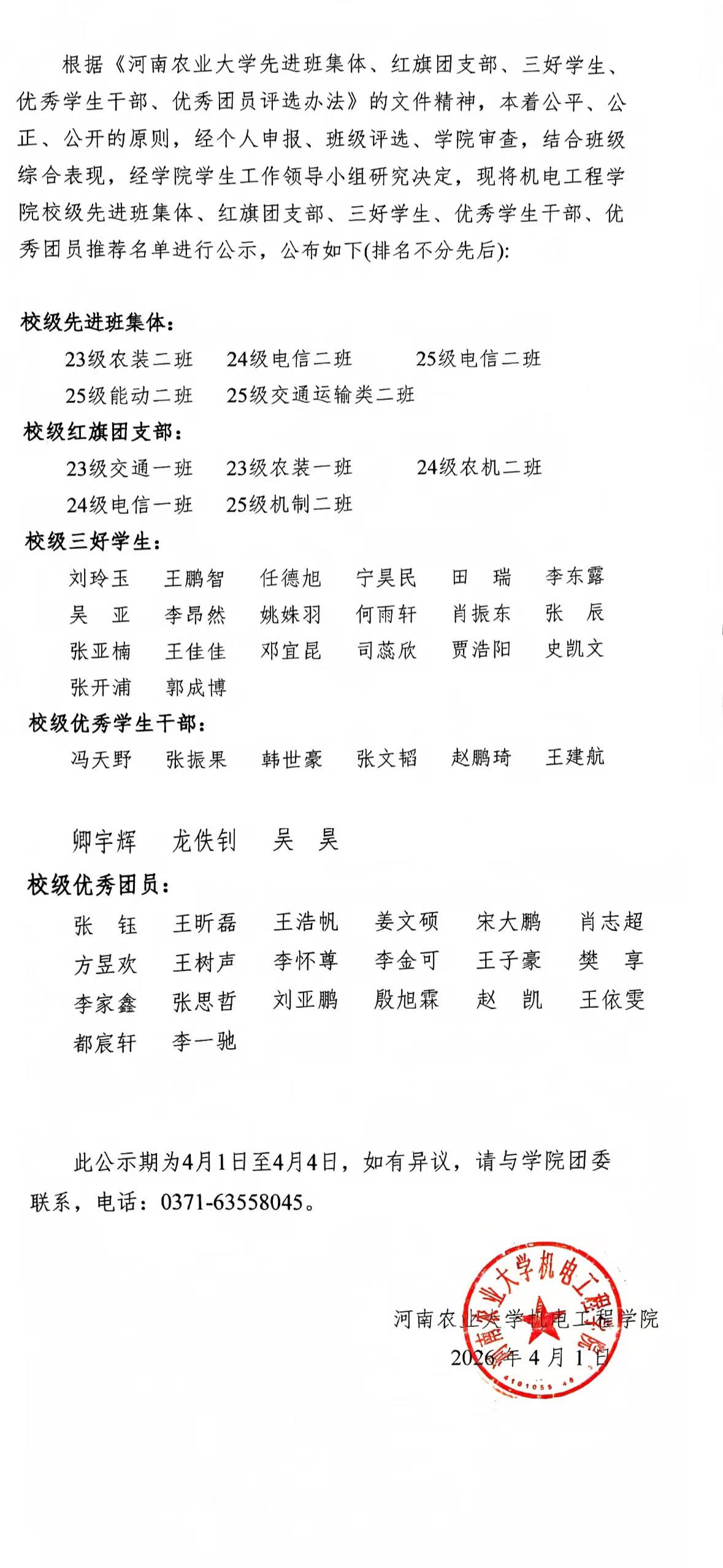 根据《河南农业大学先进班集体、红旗团支部、三好学生、优秀学生干部、优秀团员评选办法》的文件精神,本着公平、公正、公开的原则,经个人申报、班级评选、学院审查,结合班级综合表现,经学院学生工作领导小组研究决定,现将色情av影片 校级先进班集体、红旗团支部、三好学生、优秀学生干部、优秀团员推荐名单进行公示,公布如下,(排名不分先后):